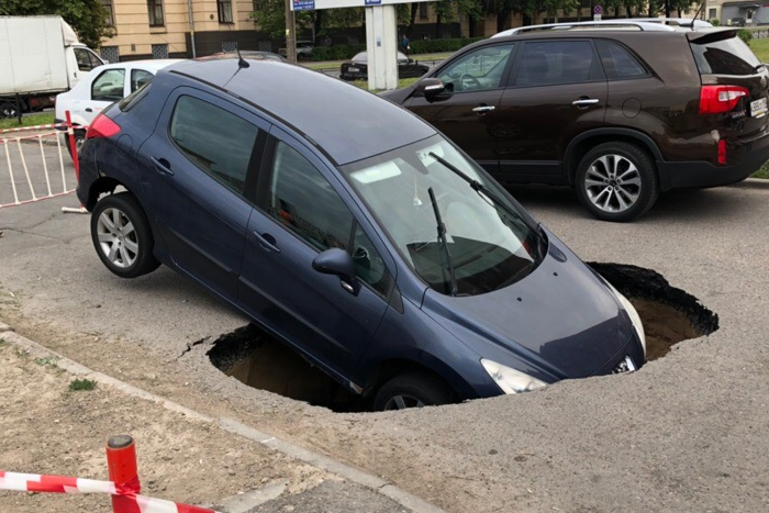 На Варшавской улице в Петербурге около дома № 29 автомобиль провалился в яму. Как пишет «Фонтанка», под машиной «разошелся» асфальт во время испытаний теплосетей.