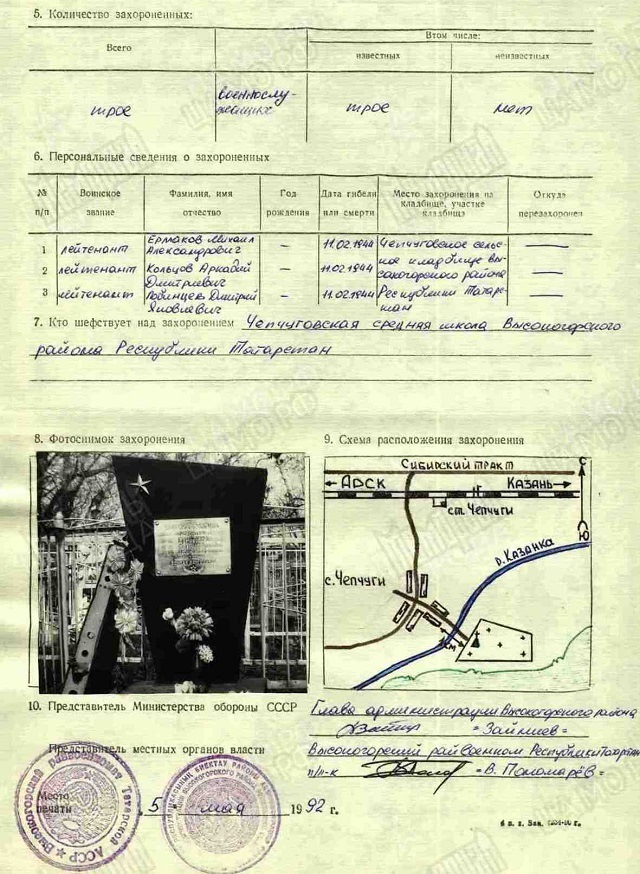 А семья Аркадия Кольцова вела свои поиски. Накануне 65-летия Победы родные решили еще раз задать данные в поиск "Мемориала". И неожиданно получили ответ, что Аркадий похоронен в деревне Чепчуги (Высокогорный район Татарстана). Там есть братская могила, за которой ухаживают учащиеся местной школы. К ответу прилагалась карта-схема с инструкцией, как туда добраться.