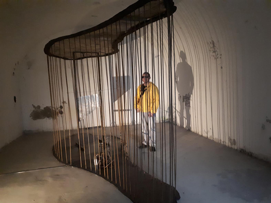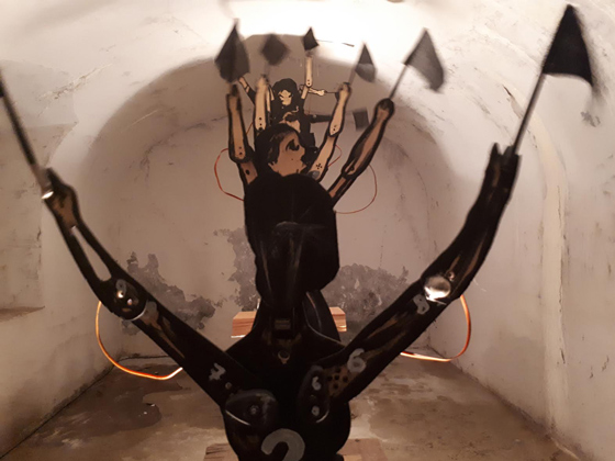 «Чего я еще жду?» — клетка, в которой механизм заставляет работать небольшую гильотину (еще один предмет, усиленный местом). Клетка — метафора власти, тема свободы и освобождения хоть и не раскрыта (лезвие не опускается до конца, гильотина работает вхолостую), но нерв работы удачно резонирует с локацией (рядом — жутковатая дверь-решетка между залами). Ну а «Иллюзии» — менее зрелищная работа, посвященная границам в самом разном их понимании: кубики цвета хромакея и серо-белого пустого места в графическом редакторе. Опять же в контексте форта с отсыревшими толстыми стенами и лужами в темных «мешках» — традиционными атрибутами границы — кубики и граница цифровая выглядят изящной шуткой.