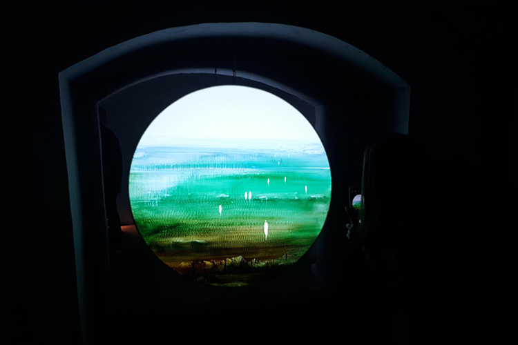 Татьяна Ахметгалиева. Исчезнувшие лестницы (2015). Видео. Общий вид зала видеоинсталляций. Валентина Луценко. Кто-то насыпал земли (2019). Двухканальная видеоинсталляция. Сергей Катран. Зал ожидания (2019). Интерактивная инсталляция