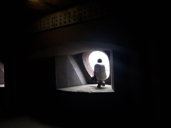 «Впередсмотрящих» сложно в этом упрекнуть: старый холодный форт — не выставочный зал и не модное «творческое/креативное пространство» с пуфами. Это место, куда родители не пускают маленьких детей, лабиринт, милитаристский Хогвартс пятилеток, наконец, для взрослых дядь и теть — памятник истории в сомнительном состоянии. Там холодно, не отремонтировано и не убрано, окна заколочены где чем, жуткие двери-решетки скрежещут по полу. Большинство залов — жутковатые мешки без окон, но с вентиляционными шахтами, из которых вас обдает шумами соседних объектов. На полу — рельсы, по которым некогда возили орудия, но в темноте вы скорее ощущаете их под подошвой, чем видите. В общем, локация мощнейшая, но и способная перекрыть недостаточно уверенные высказывания.
