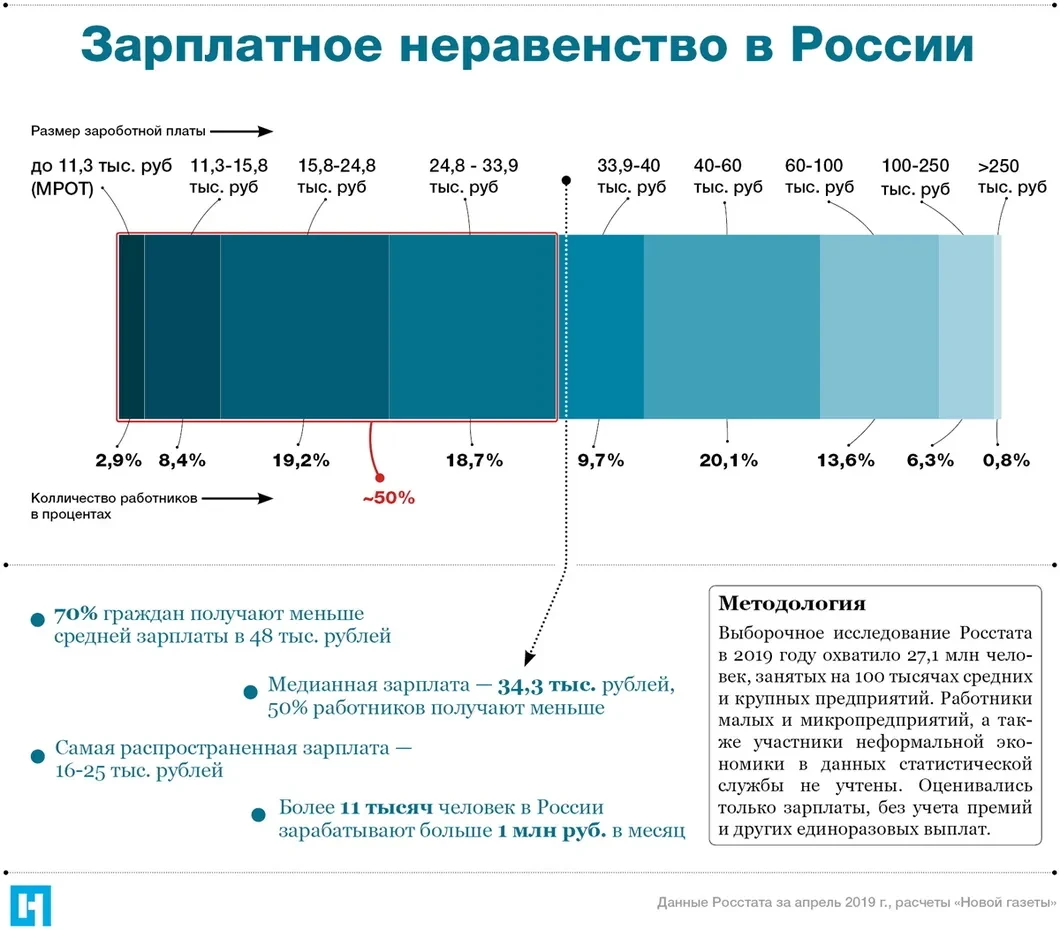 Расхождение в 28% между медианной зарплатой и средней похоже на правду. Для многих людей в регионах, у которых зарплата 20–30 тысяч рублей, цифра средней зарплаты в 48 тысяч рублей оставалась непонятной.