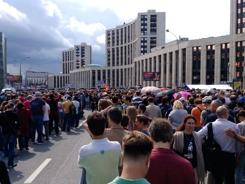 Митинг на проспекте Академика Сахарова в Москве, посвященный предстоящим выборам в Мосгордуму, по подсчетам корреспондентки Полит.ру Ани Гольдман собрал порядка десяти тысяч человек.