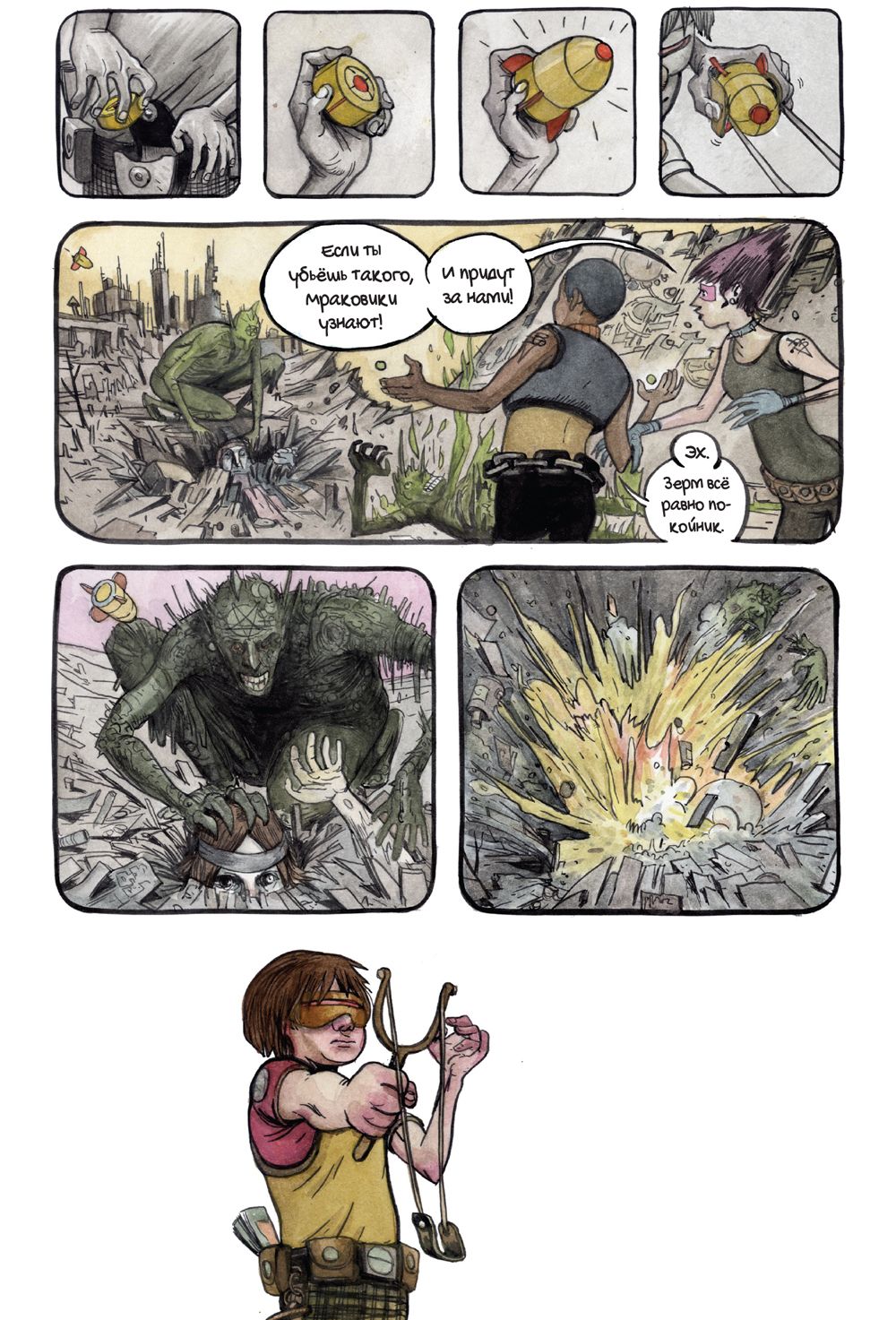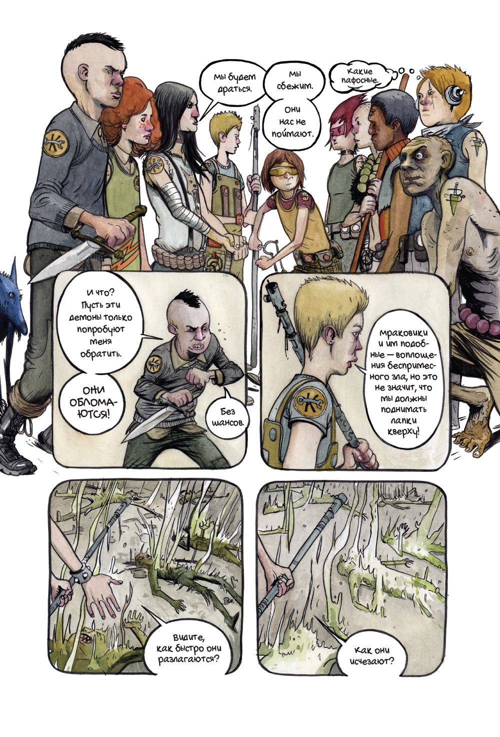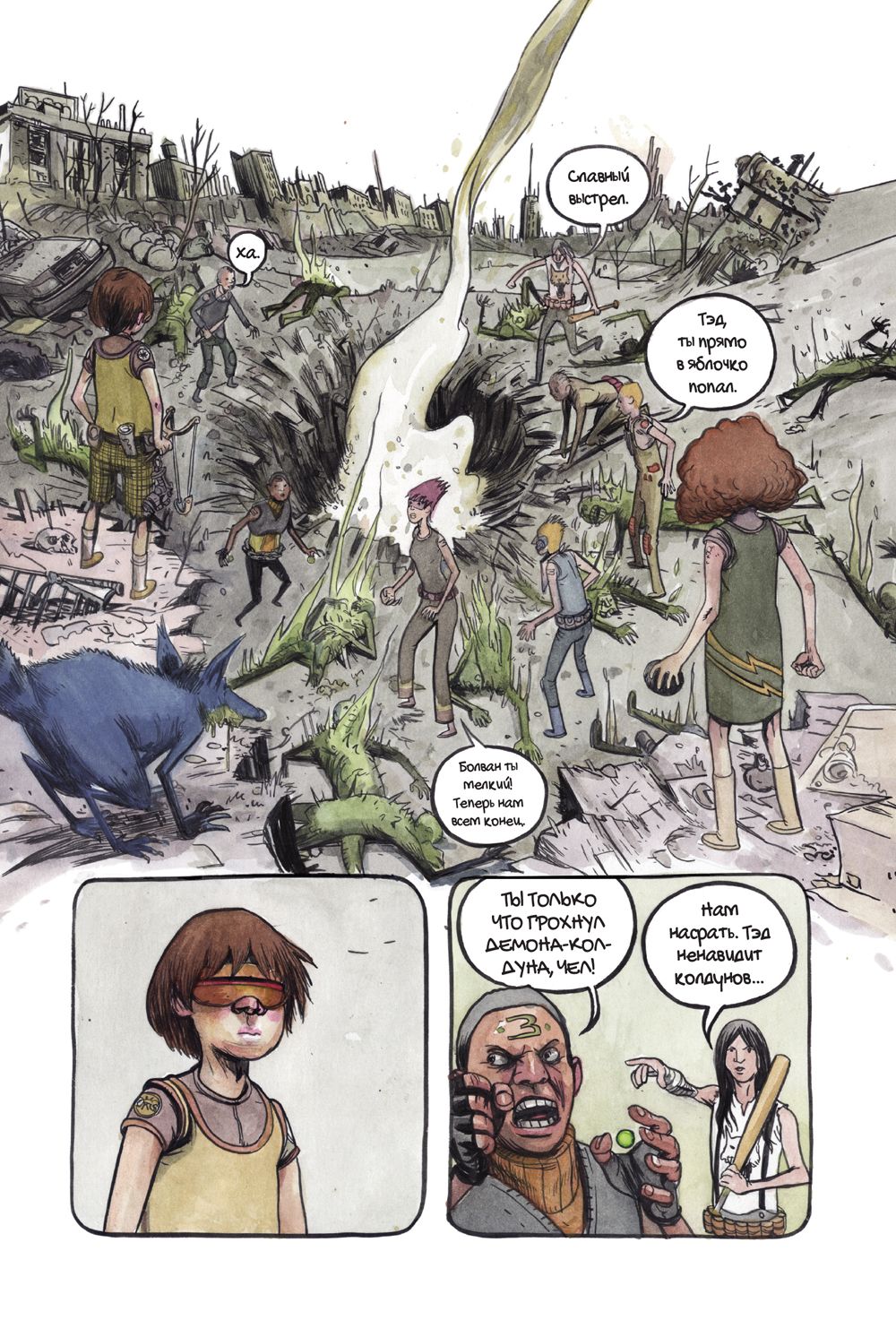 Издательство «Комильфо» в конце июля выпустит комикс «Крутилы» — работу американского художника и сценариста Фарела Далримпла. Это история о подростках — их называют Крутилами, — которые сражаются с проникшими на Землю кровожадными существами. Чудовищ случайно выпустили сами Крутилы — они спустились в таинственную пещеру, куда нельзя было заходить. «Медуза» публикует фрагмент комикса.