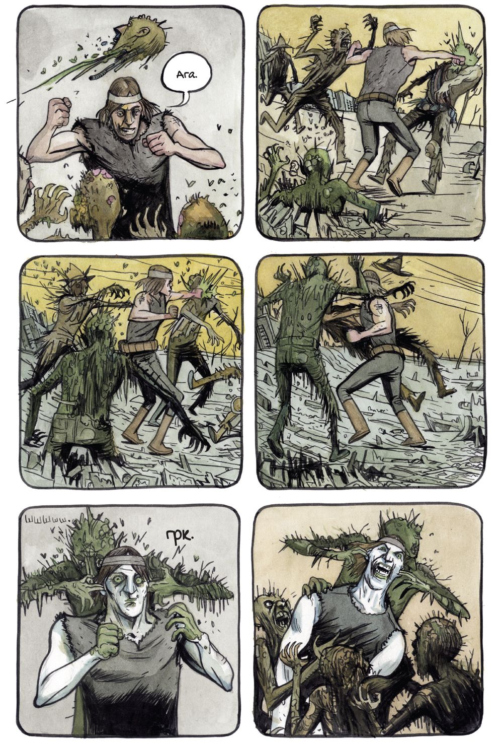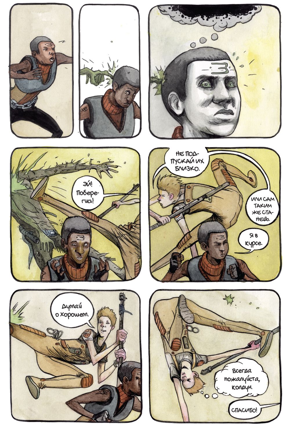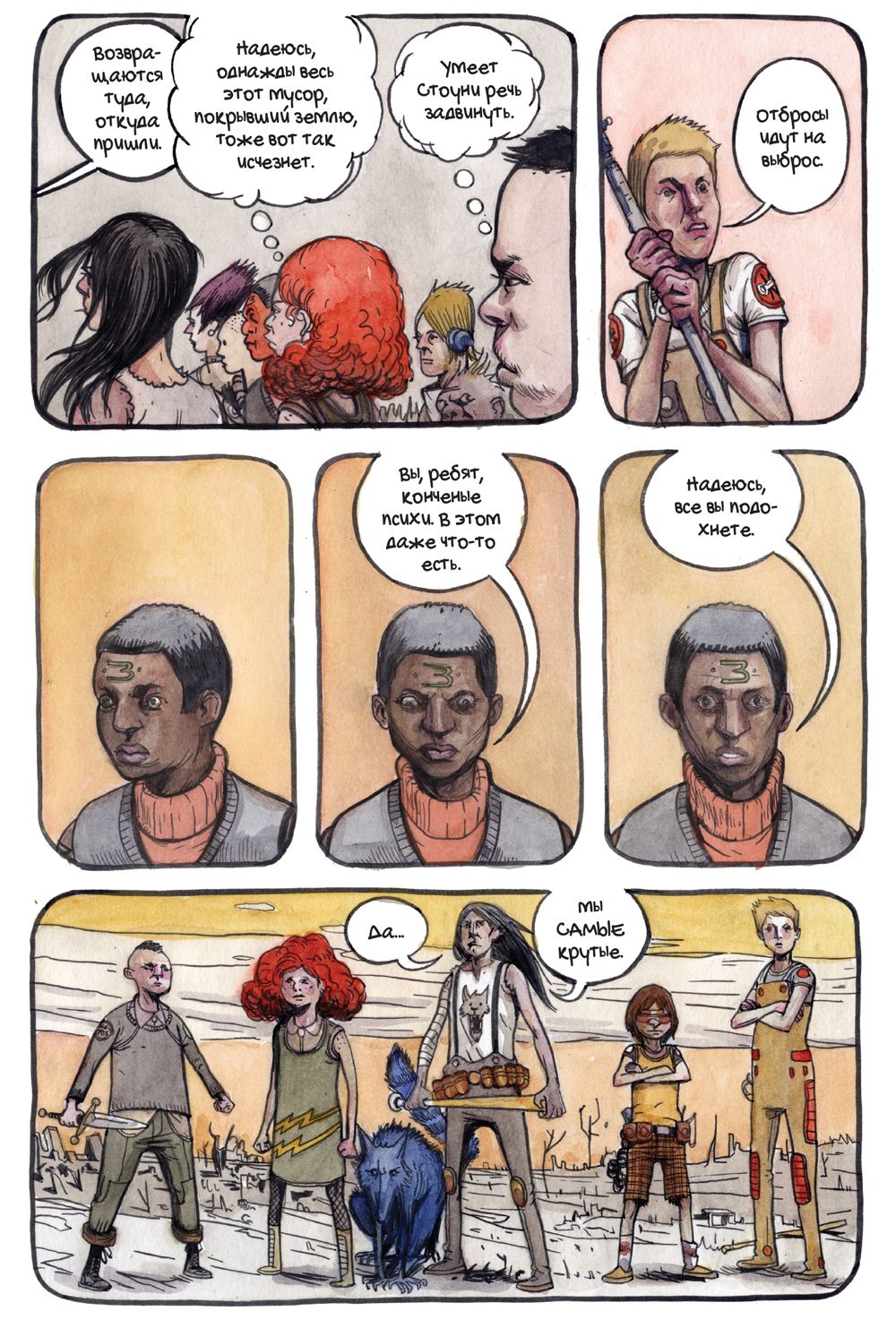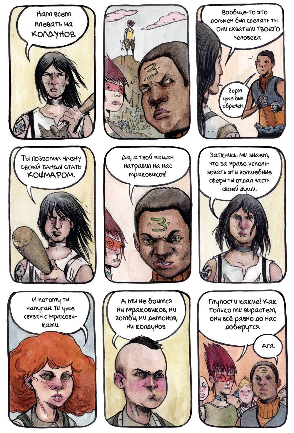 Издательство «Комильфо» в конце июля выпустит комикс «Крутилы» — работу американского художника и сценариста Фарела Далримпла. Это история о подростках — их называют Крутилами, — которые сражаются с проникшими на Землю кровожадными существами. Чудовищ случайно выпустили сами Крутилы — они спустились в таинственную пещеру, куда нельзя было заходить. «Медуза» публикует фрагмент комикса.