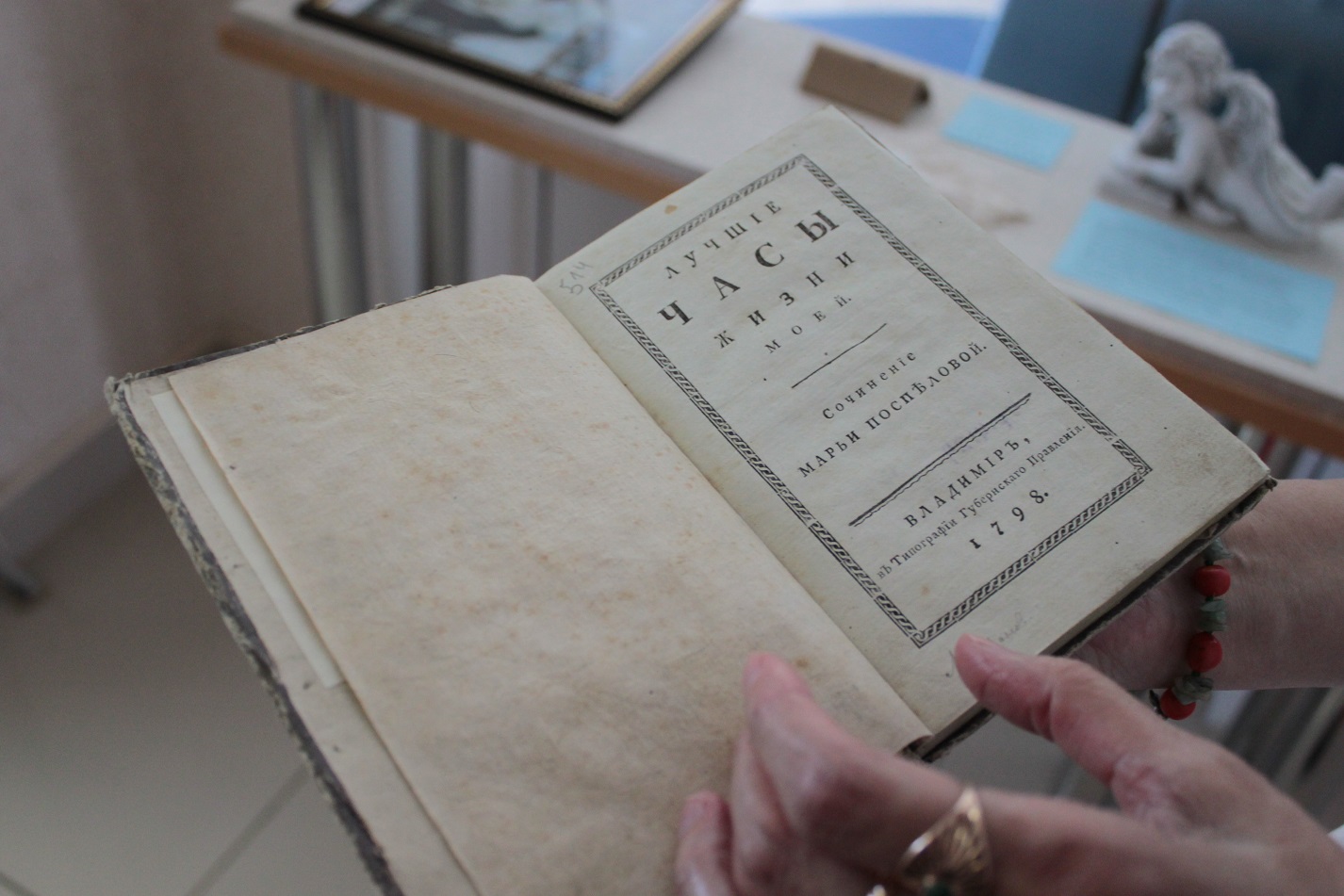 Во Владимирской областной научной библиотеке экспонируется книга “Лучшие часы жизни моей” Марьи Поспеловой – один из первых образцов владимирского книгопечатания.