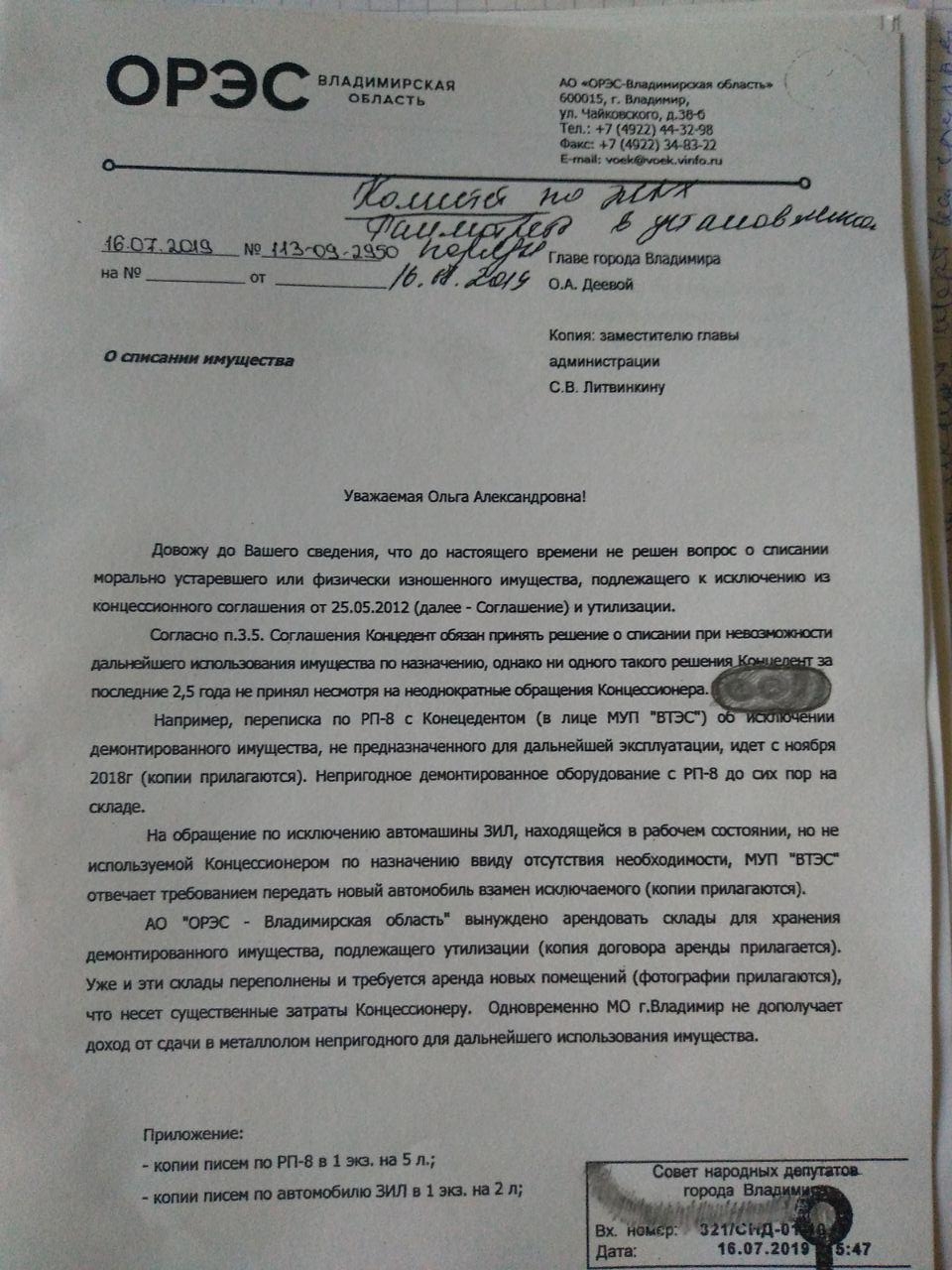 Так, в заявлении указано, что по устаревшему трансформаторному оборудованию, ранее установленному на распределительном пункте №8, переговоры ведутся с ноября прошлого года. А старый трансформатор до сих пор на складе. Также взамен очень старого автомобиля ЗИЛ МУП “ВТЭС” требует сдать новый. Перечень необходимых списаний прилагается к заявлению на двух листах.