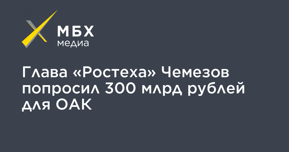 Глава корпорации «Ростех» Сергей Чемезов на встрече с Владимиром Путиным заявил, что докапитализация «Объединенной авиастроительной корпорации» (ОАК) требует еще 300 млрд рублей. Стенограмма встречи опубликована на сайте Кремля.