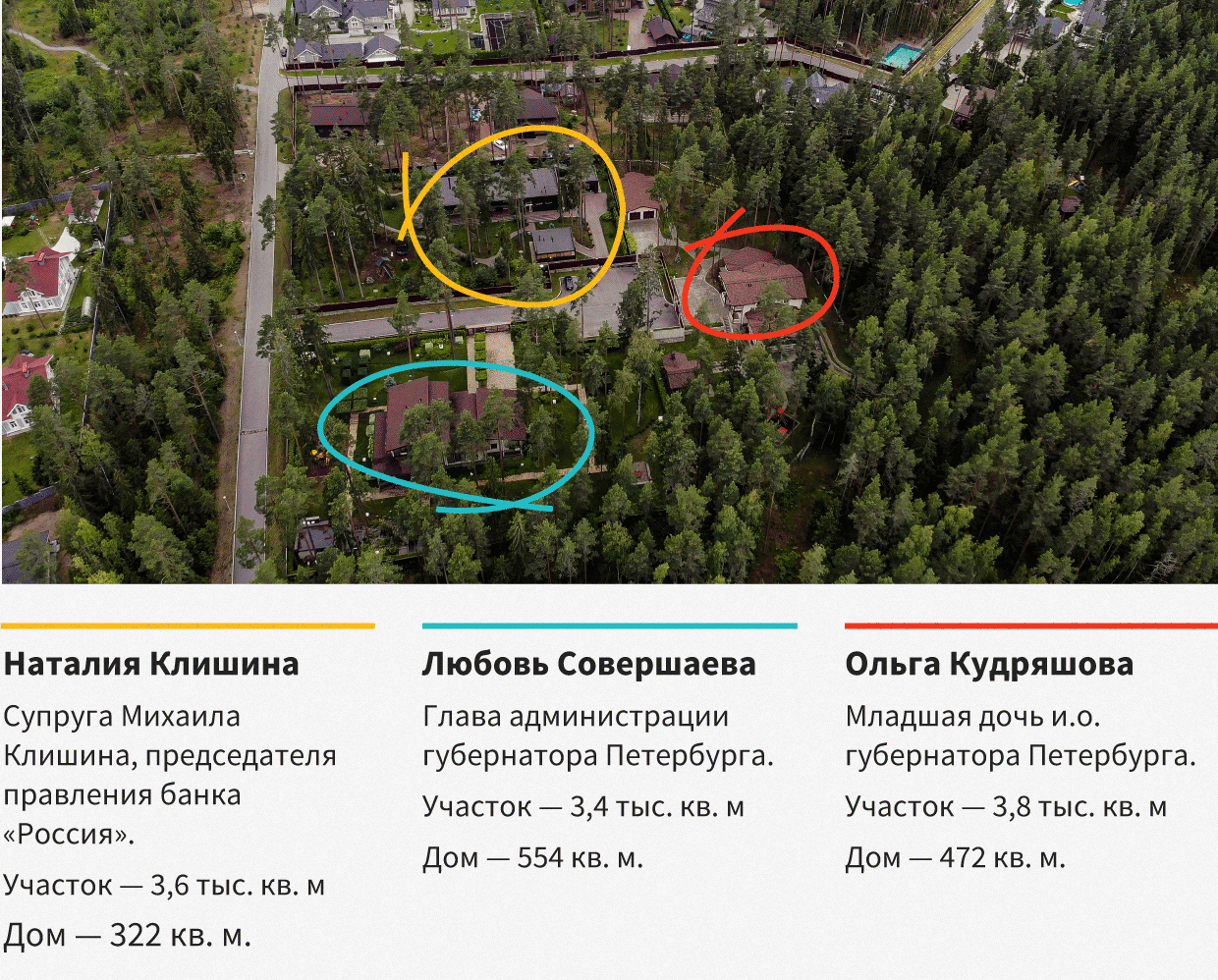 Соседка Совершаевой по корпоративному поселку Игоры — младшая дочь Александра Беглова Ольга Кудряшова, напротив них живет супруга совладельца банка «Россия» Михаила Клишина, соседний дом принадлежал дочери Михаила Левченкова, возглавлявшего «Газпром-инвест» (в прошлом году он покинул компанию после громкой истории о пропавшем газопроводе). Также в поселке живут бывший полпред президента Илья Клебанов, бывшие сотрудники «Пятого канала», который входит в Национальную Медиа Группу, и других структур Юрия Ковальчука.