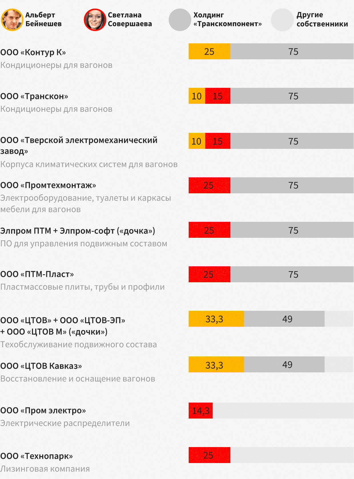 Наконец, у фирм «Транскомпонента» есть созданная в 2017 году управляющая компания «Ключевые системы и компоненты» (КСК). На сайте «КСК» указано, что она является партнером «Трансмашхолдинга». Представитель КСК сначала общался с The Bell, но, получив вопросы с упоминанием Любови Совершаевой, перестал отвечать на звонки и сообщения.