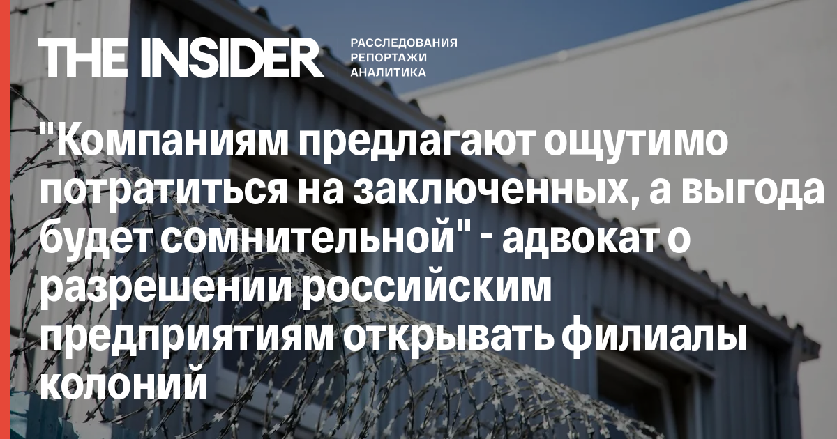 Владимир Путин подписал проект поправок в Уголовно-исполнительный кодекс, который разрешает открывать филиалы колоний на крупных предприятиях. Будут созданы два вида филиалов колоний: в режиме колоний-поселений и в режиме исправительных центров. На стройках и предприятиях будут трудиться осужденные на небольшой срок за нетяжкое преступление или заключенные, которым режим был смягчен. Закон призван решить проблему с трудоустройством заключенных, так как им больше не придется тратить время на дорогу до работы и обратно. Адвокат, управляющий партнер КА Pen & Paper Валерий Зинченко рассказал The Insider, почему целесообразность нового закона вызывает сомнения.