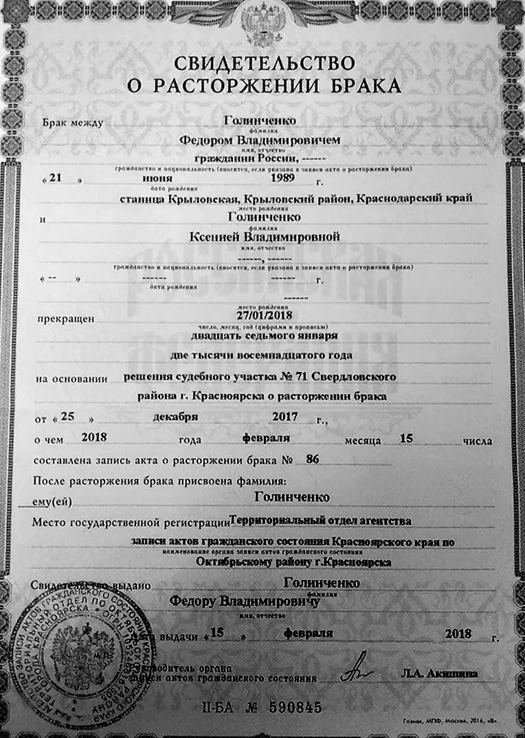 Сама Ксения говорит, что до сих пор не получила копии документа о расторжении брака: «Оформлен развод или нет, для меня это вопрос. Когда документы отправляют, разводят через суд по заявлению одного из супругов, то обязательно приходит копия. Мне ничего не приходило. Я ему отправляла адрес, он в курсе, куда отправить документ. Мне ничего не приходило, никаких уведомлений, чтобы обновить данные в паспорте, поставить штамп о разводе. Задним числом был в итоге сделан документ, или липовый он, я не знаю».
