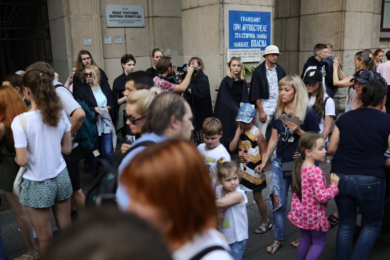 Вечером 23 июля более 50 человек вышли на Невский проспект, чтобы провести акцию памяти активистки Елены Григорьевой, убитой в ночь на 21 июля, и других жертв гомофобии. Участники акции несли цветы, вставали в пикеты, а также надевали на плечи черные накидки. «Бумага» публикует три фотографии с акции.