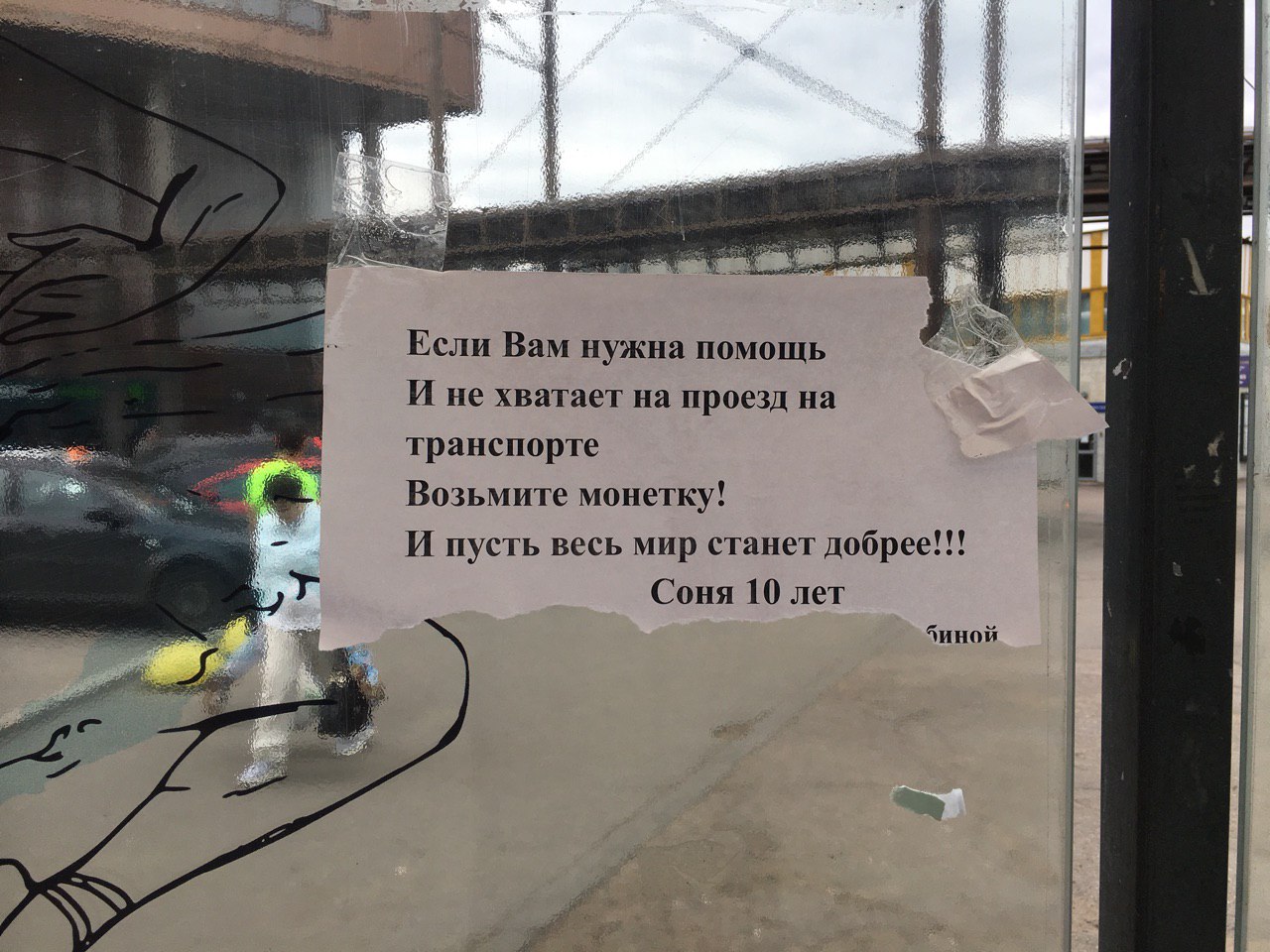 На автобусной остановке рядом со станцией метро «Озерки» местные жители заметили объявление с прикрепленными к нему монетами. Объявление подписано 10-летней Соней Рыбиной, а прохожим предлагают взять деньги, если им не хватает на проезд.