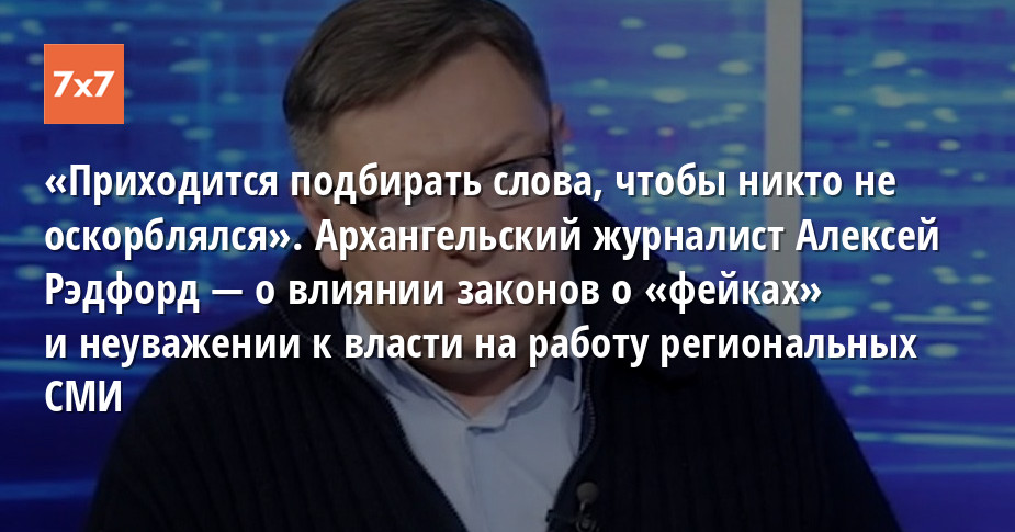 Алексей Рэдфорд — один из самых известных журналистов в Архангельской области, в профессии — с 1985 года. Сейчас он работает редактором радио «Эхо Москвы. Северодвинск» и делает интервью для независимого телеканала СТВ («Телевидение Северодвинска»). О том, есть ли цензура в региональной журналистике и как власть может использовать законы о фейковых новостях и о неуважении к себе против независимых медиа, Рэдфорд рассказал в интервью «7x7».