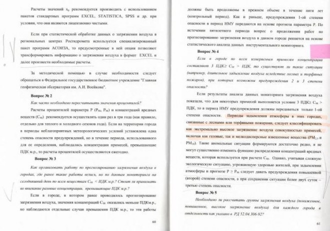«Периоды задымления атмосферы в городах, связанные с лесными и торфяными пожарами, следует классифицировать как экстремально высокое загрязнение воздуха совокупностью примесей, включая как газовые, так и мелкодисперсные взвешенные вещества. Такие аномальные ситуации формируются достаточно редко и не могут существенно изменить распределение концентрации вредных веществ. Однако, учитывая сложную экологическую ситуацию, угрожающую здоровью жителей, при задымлении атмосферы и соответствующем прогнозе следует давать предупреждения повышенной (второй) степени опасности, а при сохранении ситуации более двух суток – третью степень опасности».