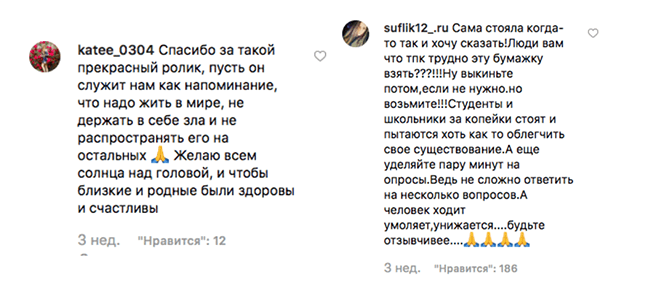 «Я из Харькова, мне 25 лет, сама воспитываю двух дочек. Очень люблю твои ролики, они всегда до слёз», — рассказывает в комментариях под постом для знакомства с подписчиками Виктория.