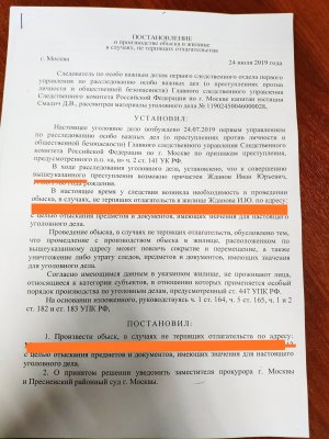В документе указано, что проведение обыска обуславливается обстоятельствами не терпящими отлагательств.