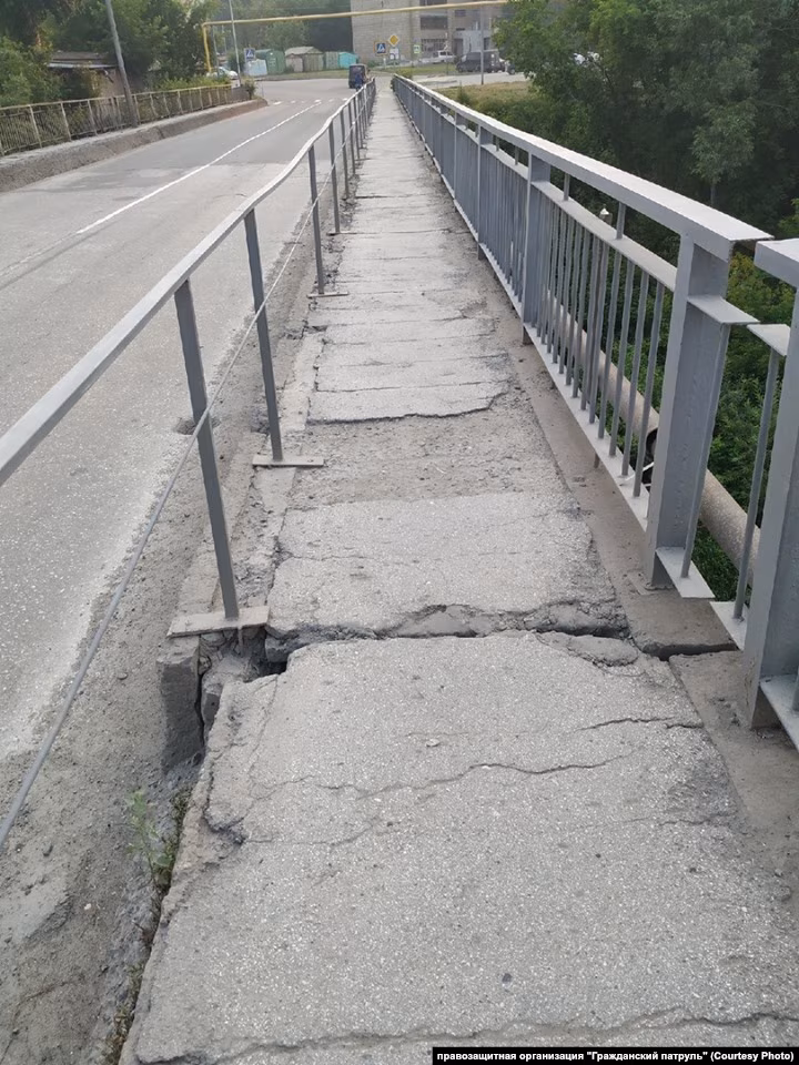 "Мост в ужасающем состоянии, он весь шатается с той стороны, где еще можно ходить пешеходам. Вчера заметили, как качаются плиты, а еще в мае этого не было. Да, в мае проводились какие-то работы, а что в них толку? Все размыло. Мы нормального ремонта просили, а они нам перильца покрасили, а под опоры бутылки пластиковые подложили", –приводятся на сайте организации слова жителей.