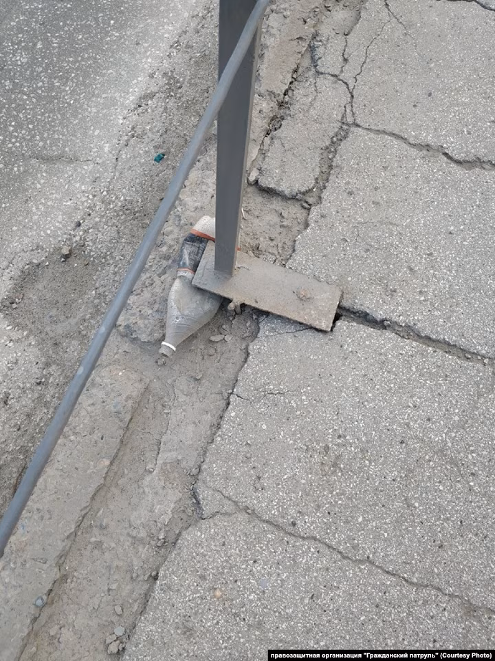 Мост был признан аварийным, и, по документам, его уже отремонтировали. Жители говорят, что ремонт ограничился покраской перил и установкой ограждения между проезжей частью и тротуаром. На фото моста видно, что стойка ограждения укреплена пластиковой бутылкой, а поверхность тротуара разрушена.