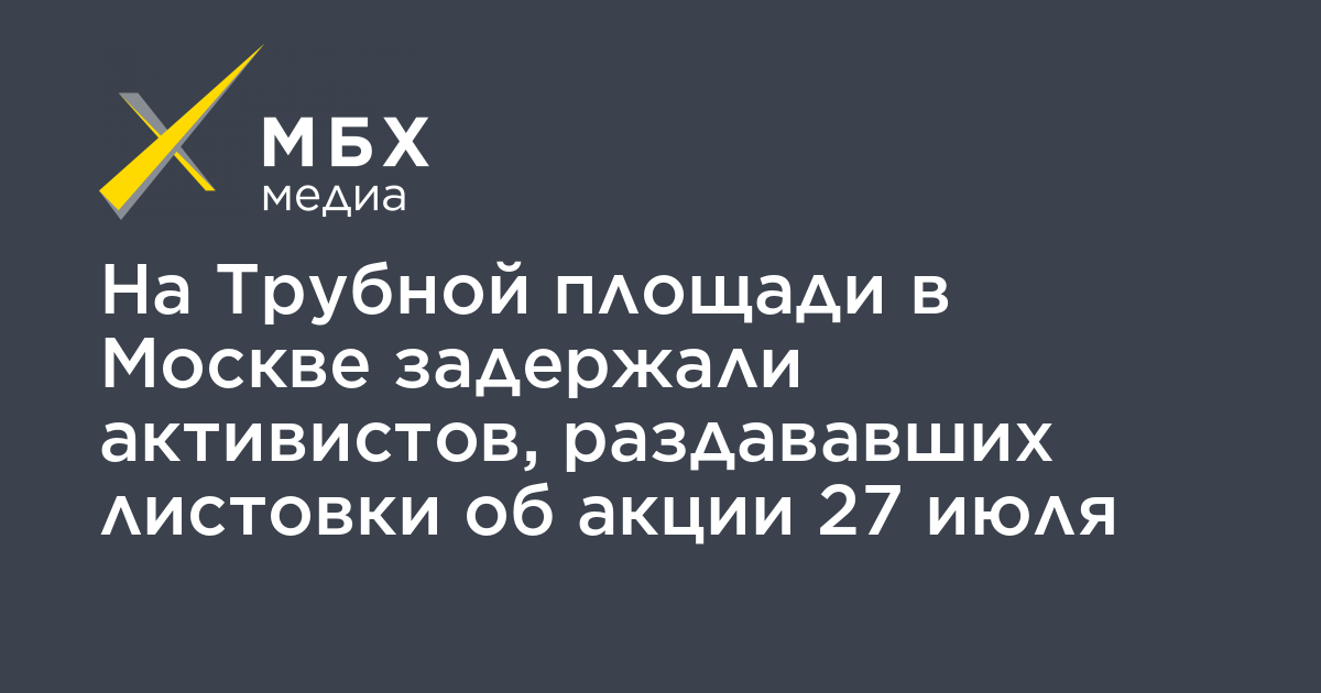 В Москве сотрудники полиции задержали четырех активистов, которые на Трубной площади раздавали листовки об акции 27 июля. Об этом «МБХ медиа» сообщил один из задержанных Александр Тепляков.