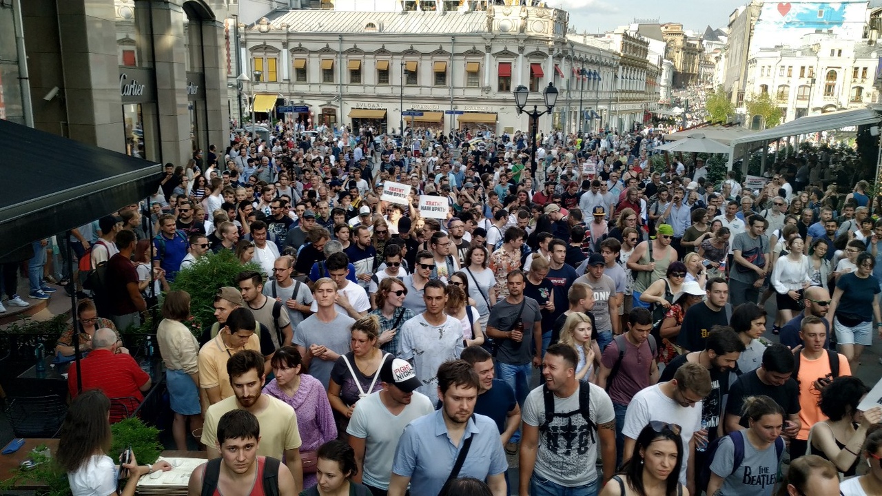18:29 Блогер Илья Варламов: «Протестующие дошли до Садового кольца с Цветного бульвара и полностью заблокировали Садовое кольцо. Народу, наверное, несколько тысяч, пока непонятно. Полиции нету, два экипажа ДПС, но они, конечно, ничего сделать не могут»