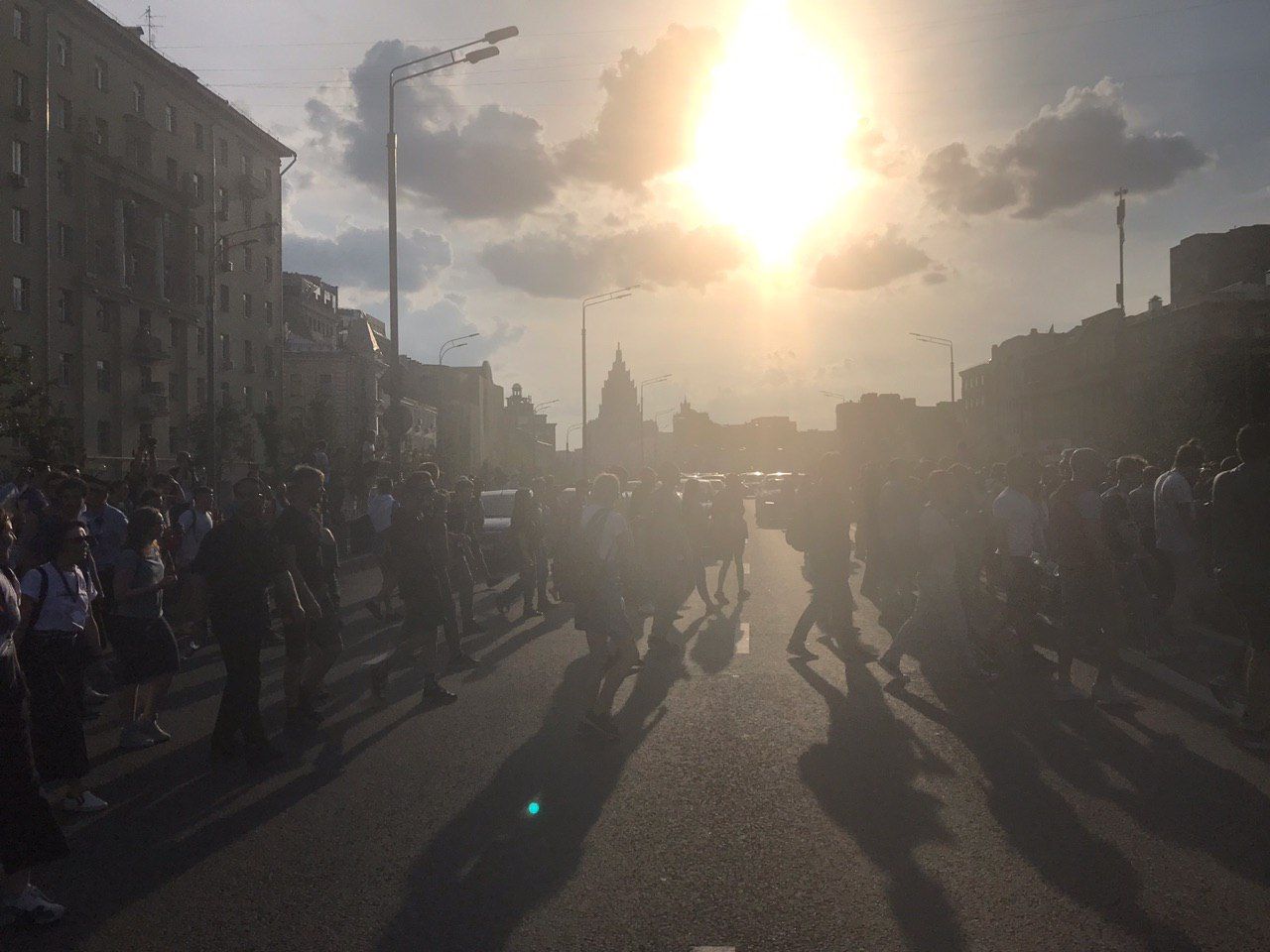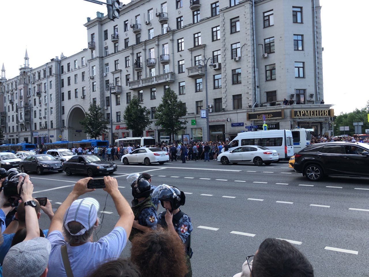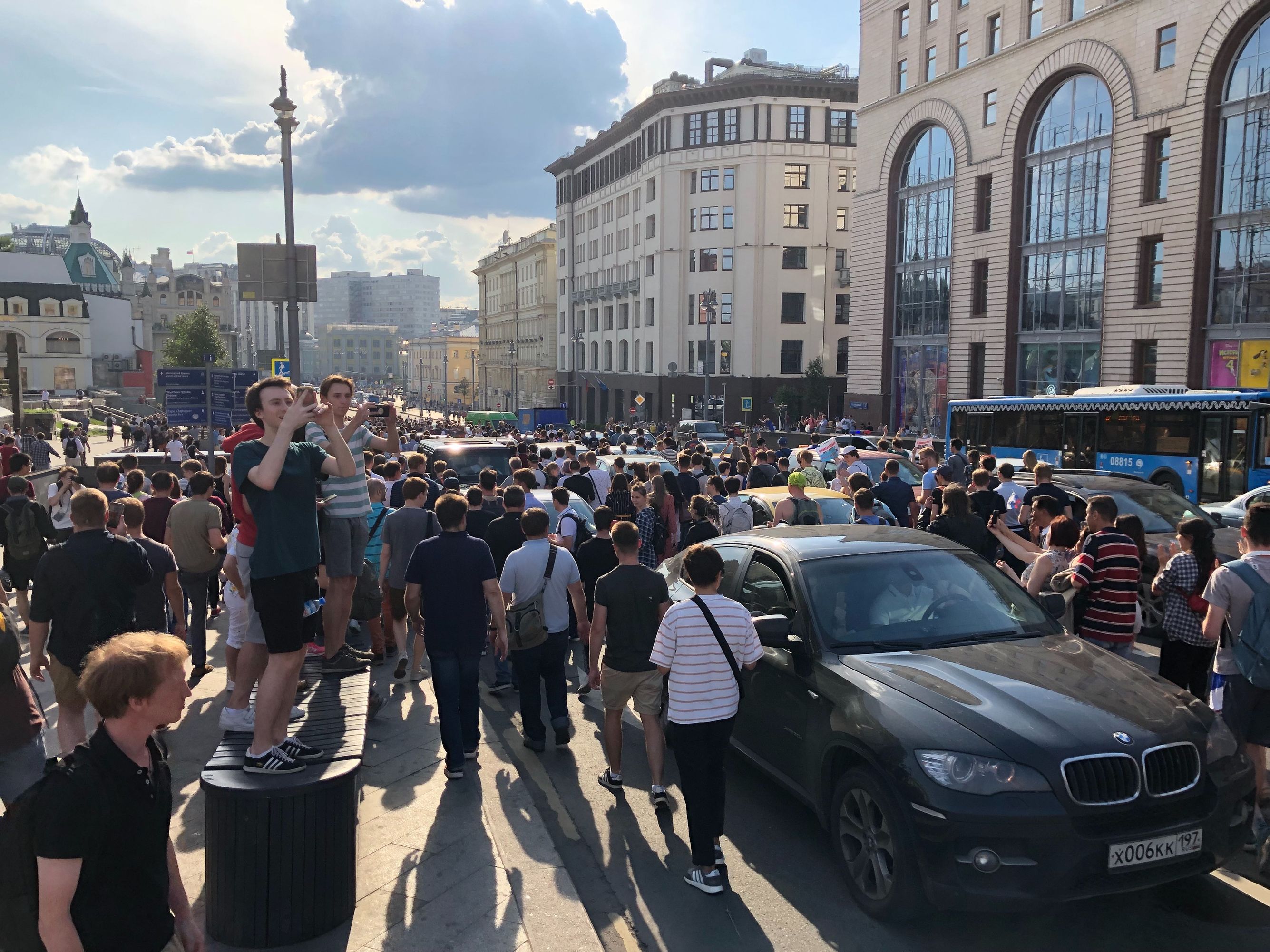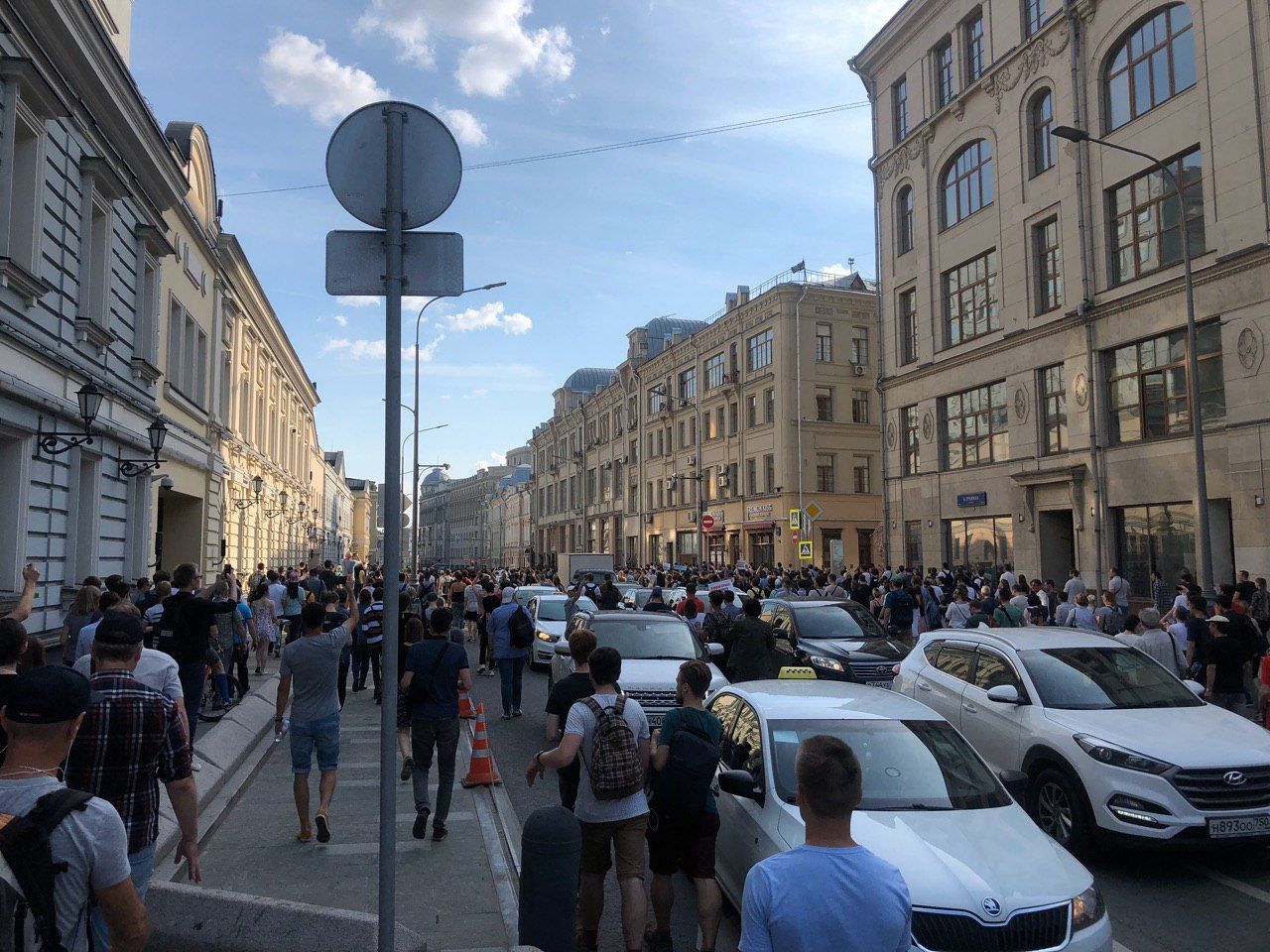 - Акция, которая была запланирована на Тверской улице у мэрии Москвы, быстро превратилась в шествие по соседним улицам и переулкам. В какой-то момент протестующие ненадолго перекрыли движение по Садовому.