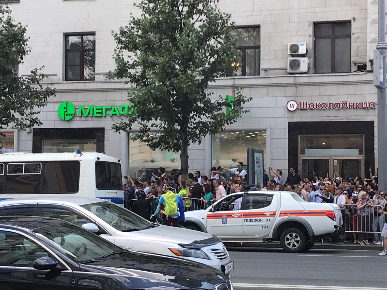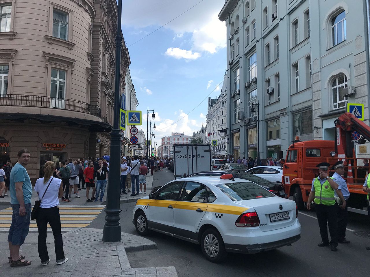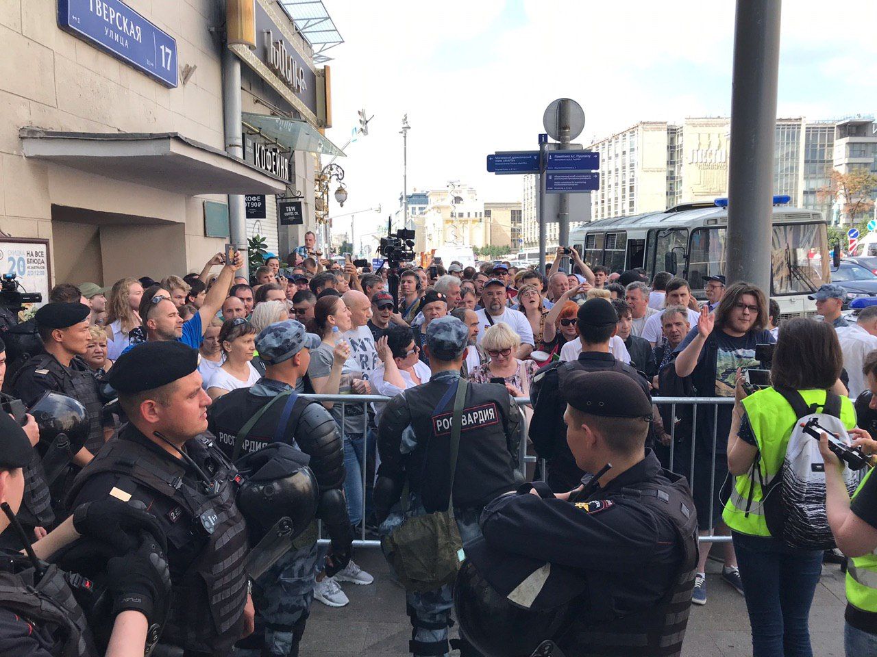 Корреспондент «Дождя» Роменский с Тверской: «Здесь не то что развернуть плакат, крикнуть лозунг — просто невозможно долго стоять на одном месте. Если задерживаешься, к тебе сразу возникают вопросы. При любом пререкании — отправляют в автозак»