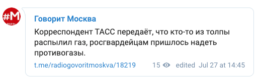 «Новая газета»: «Уважаемые граждане, Тверская закрыта, проходим в сторону Леонтьевского переулка», — говорят сотрудники полиции в мегафон. Люди скандируют «допускай!».