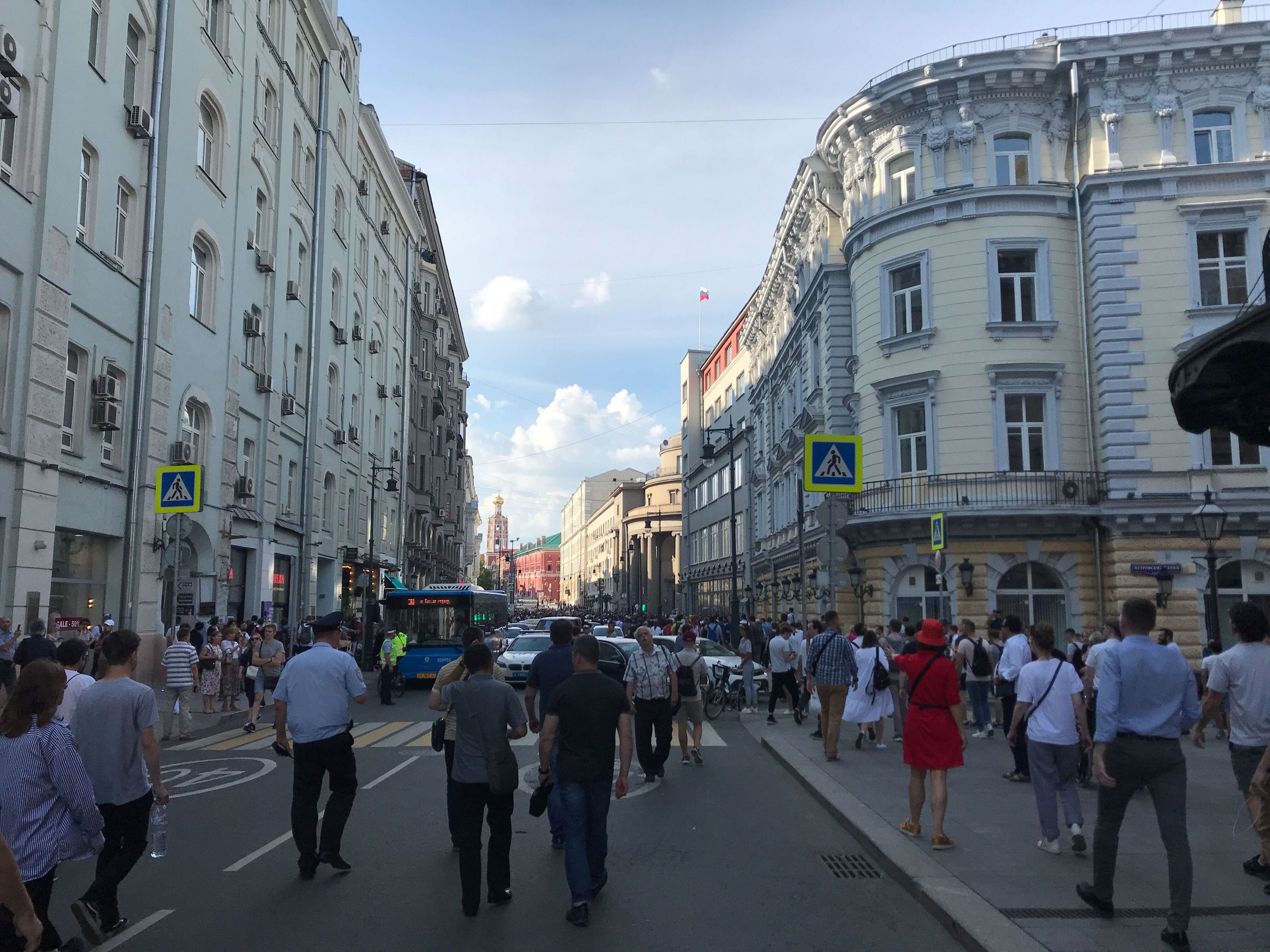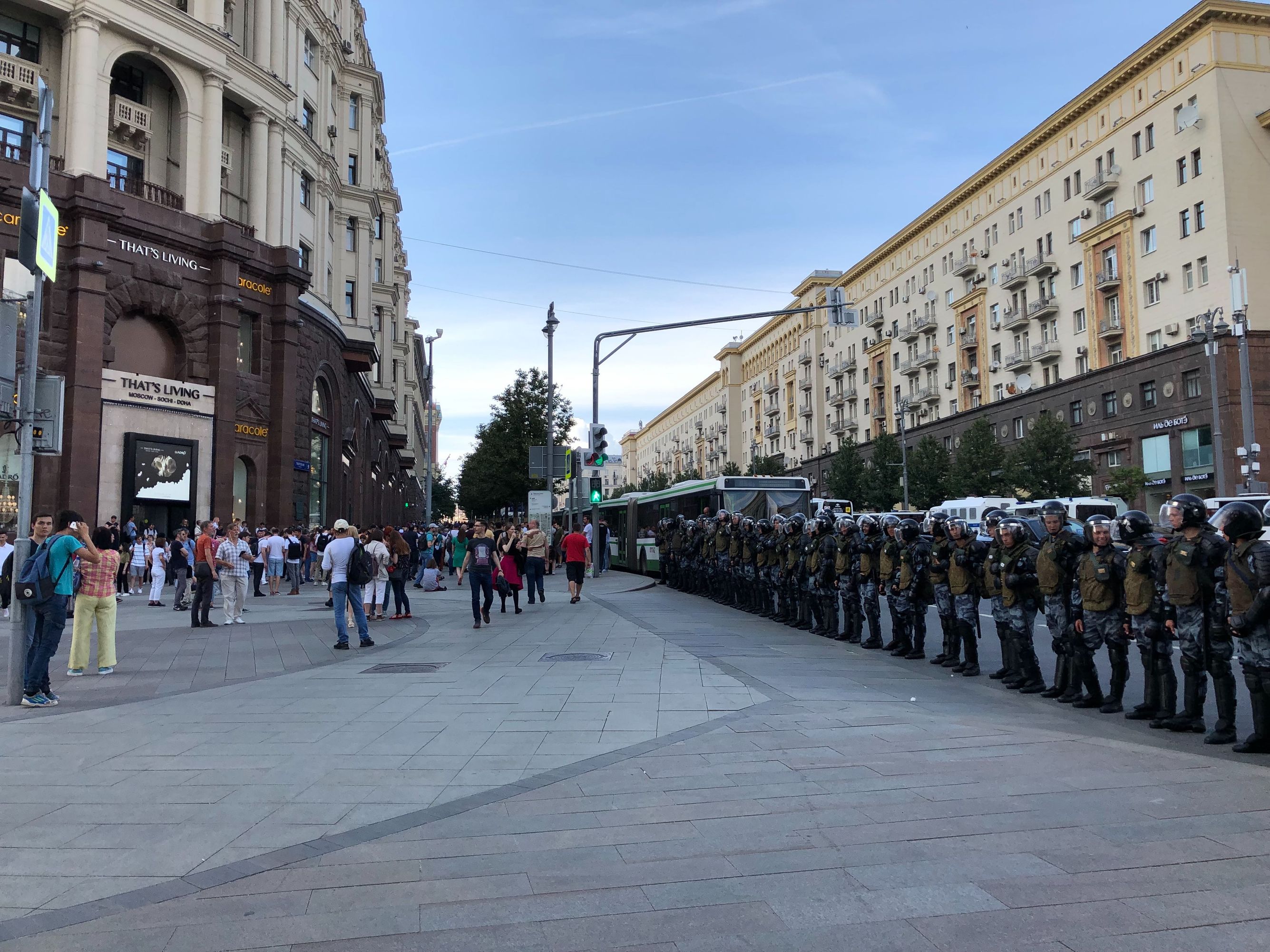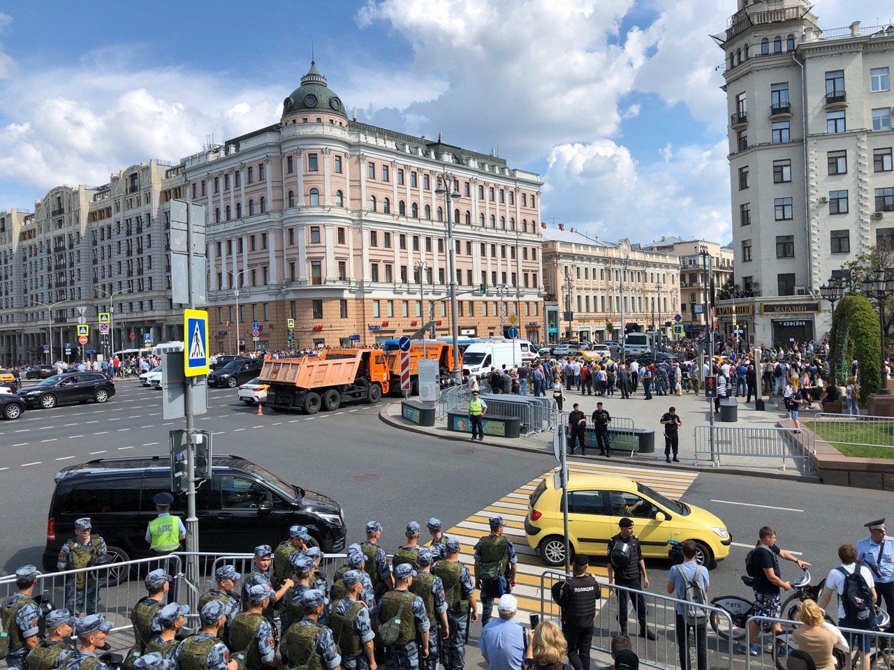 Добрый день! Сегодня в Москве +27. На Тверской улице — высокая концентрация сотрудников полиции и металлических ограждений. Почему? Потому что москвичи, недовольные недопуском независимых кандидатов на выборы в Мосгордуму, планируют выйти к зданию мэрии.