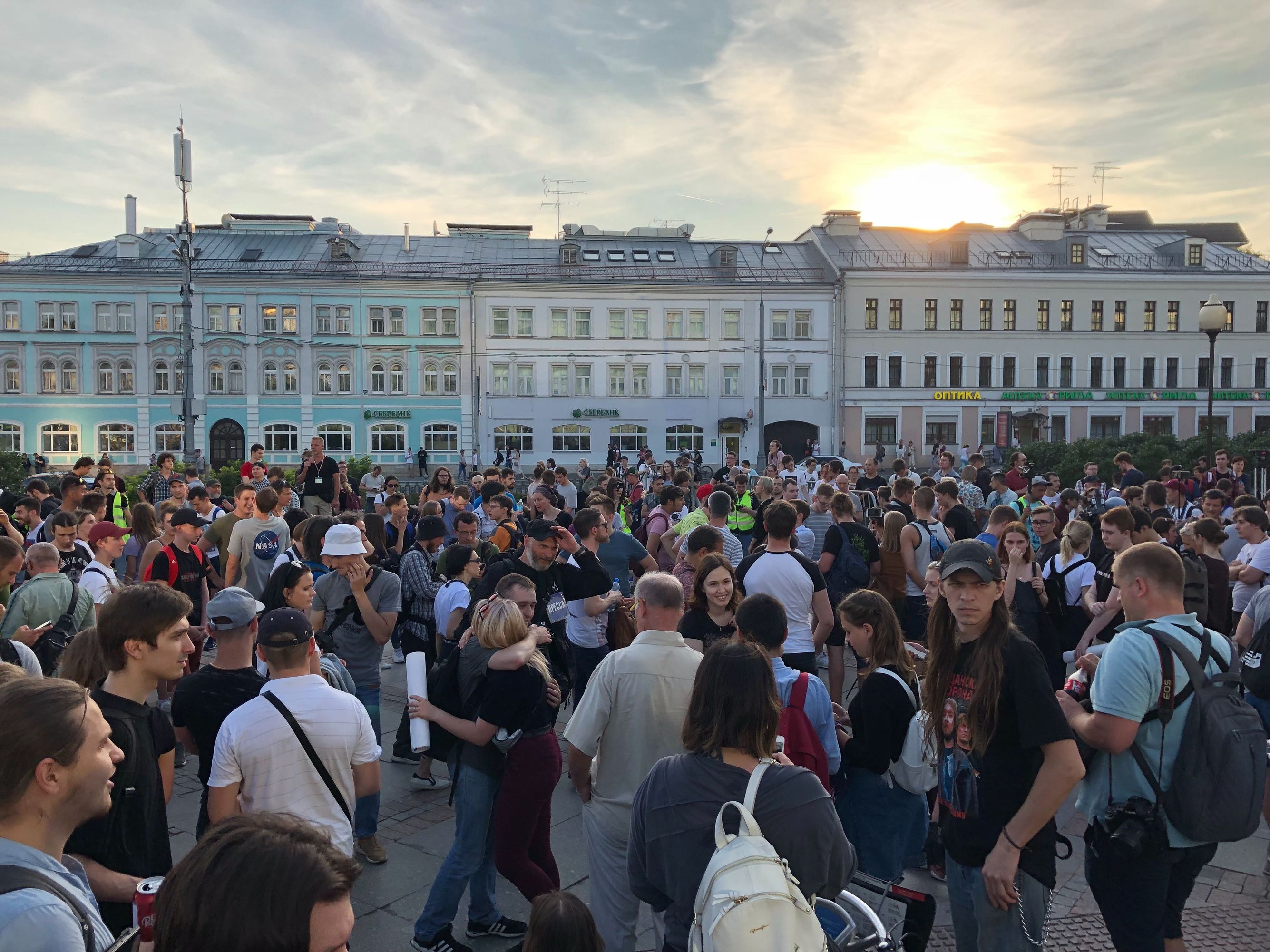 - В районе 19 часов люди начали собираться на Трубной площади, туда же направились Илья Яшин, Дмитрий Гудков, Любовь Соболь, Юлия Галямина и Иван Жданов. Их задержали утром, увезли в суды, но вечером внезапно отпустили.