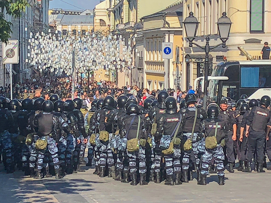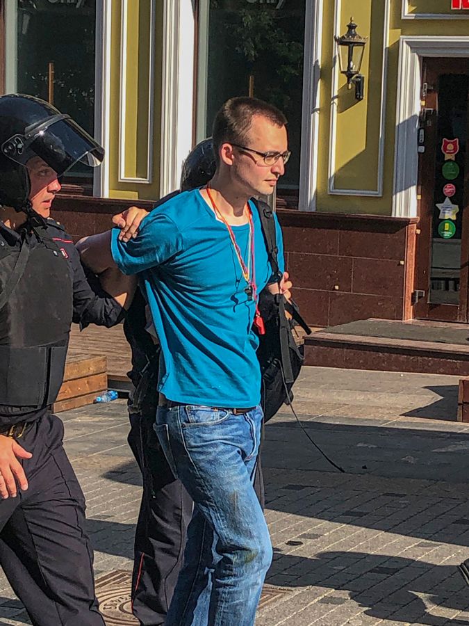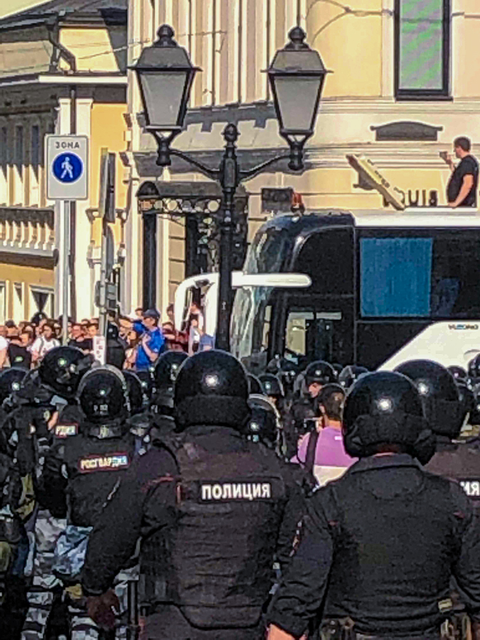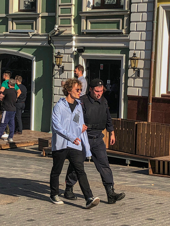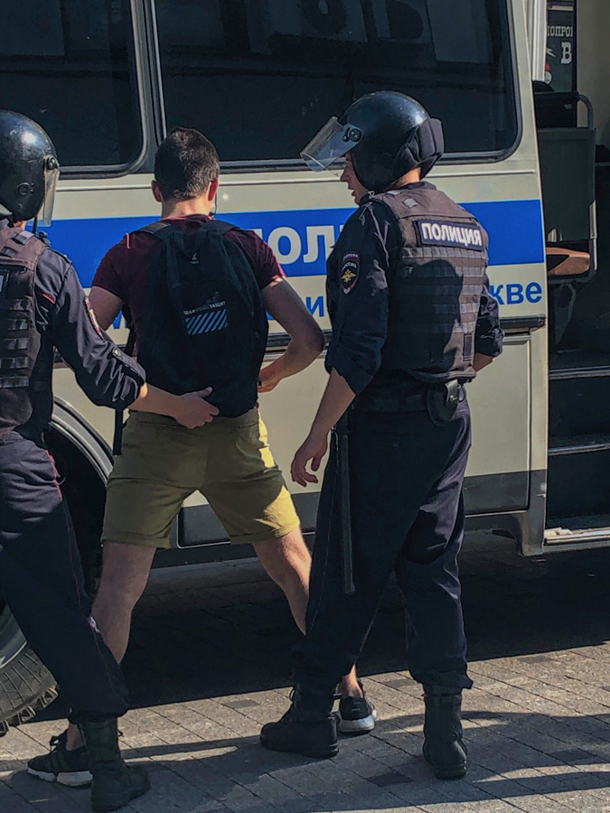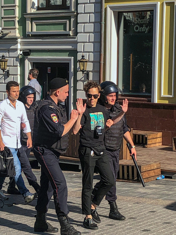 Толпа фланировала туда-сюда, то тут то там я наталкивалась на знакомые лица: диссидент Александр Подрабинек, режиссер-документалист Виталий Манский, кто-то еще, но по большей части это была молодая толпа. Я попыталась пробиться дальше, к Столешникову переулку и дальше, к Камергерскому, периодически люди скандировали «Допускай!» и «Позор» — когда кричали «позор», было понятно, что кого-то опять задержали. Тут подъехали еще автозаки, из них делово вышли молодые люди в шортах и майках — судя по всему, сотрудники ФСБ и Центра «Э» МВД, которые косили под протестующую молодежь. Следом вдоль тротуара выстроилась цепь из «космонавтов» — сотрудников Росгвардии в шлемах, наплечниках и наколенниках. По переулках и проулкам от Пушкинской площади к площади с Долгоруким просачивались группы москвичей, в одной из них был Григорий Явлинский и зарегистрированный кандидат на выборах в Мосгордуму Евгений Бунимович, но их так и оставили стоять за забором, перекрывающим подход к Тверской. А потом пошла цепь «космонавтов», которая технично выдавила всех нас к палисаднику с фонтаном перед осыпающимся от старости бывшим зданием когда-то Высшей партийной школы. Вдоль фронтона здания цепочкой выстроились омоновцы, а Ленин на пьедестале безнадежно и одиноко смотрел на то, как сотрудники Росгвардии гоняли людей по параллельным улицам, а они перекатывались от одного переулка к другому, но не уходили, а убегали и потом возвращались. Это были все молодые люди, многие парами, и они очевидно от этих салочек с Росгвардией получали удовольствие — конечно, ровно до того момента, как их скручивали и волокли в автозак. Кровь на лицах задержанных я пару раз видела.