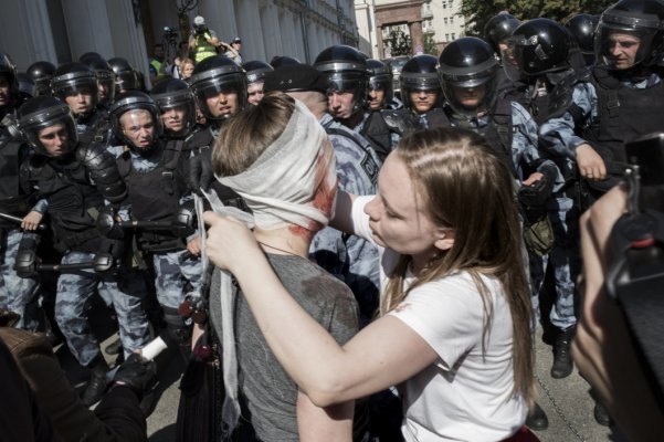 Муниципальному депутату Александре Петушиной перевязывают голову. Она получила травму во время столкновений с полиции с протестующими / Фото Анны Артемьевой из галереи «Новой Газеты»
