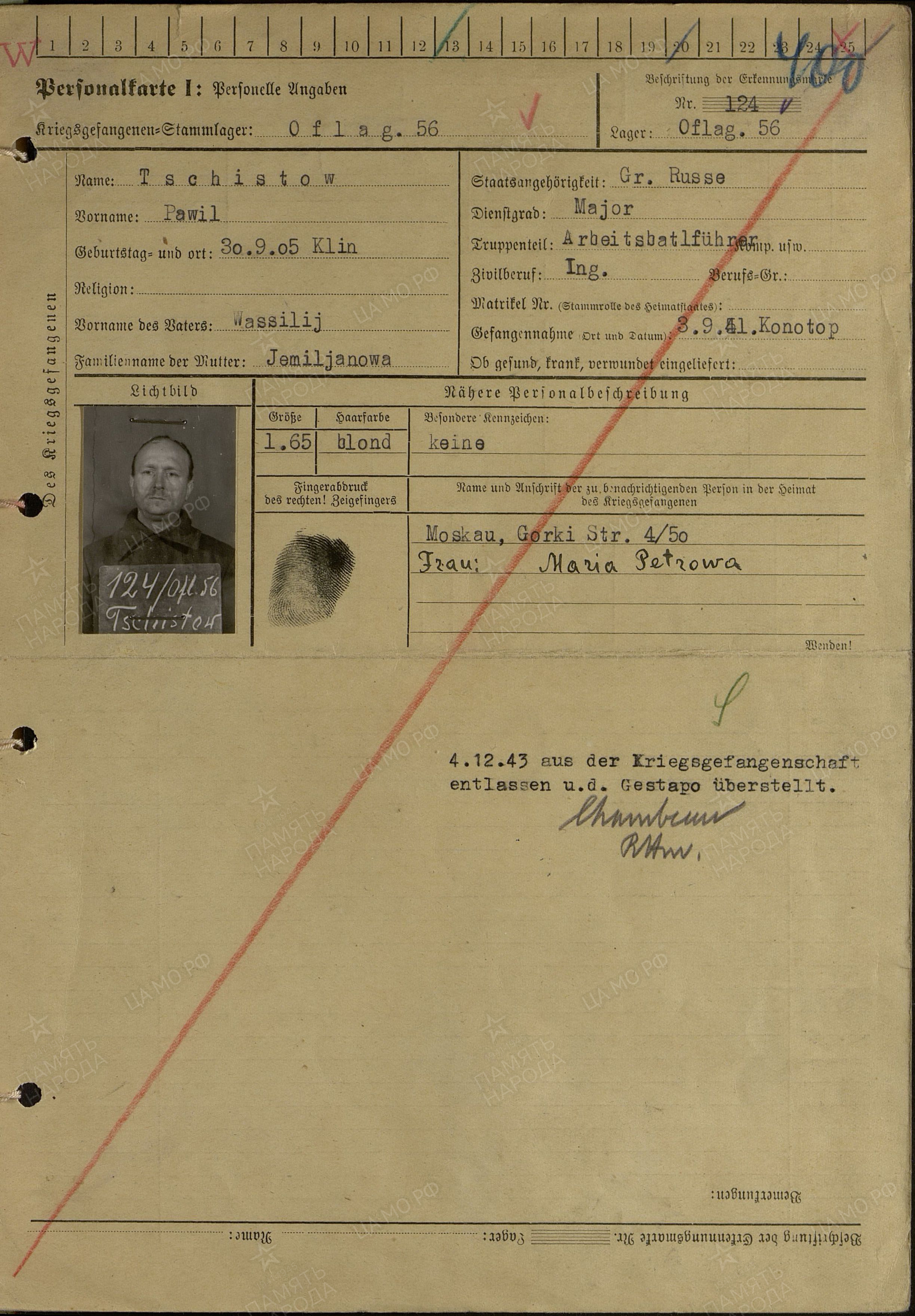 Если судьба Миронова-Короля вполне типична, то история Павла Чистова (1905–1982), которому посвящена еще одна папка из досье "Немезида", уникальна. Сотрудник госбезопасности, совершивший множество преступлений во время Большого террора, попал в плен и провел полтора десятилетия в нацистских, а затем в советских концлагерях. Дело Чистова хранится под грифом "совершенно секретно" в центральном архиве ФСБ, однако многие факты его биографии известны.