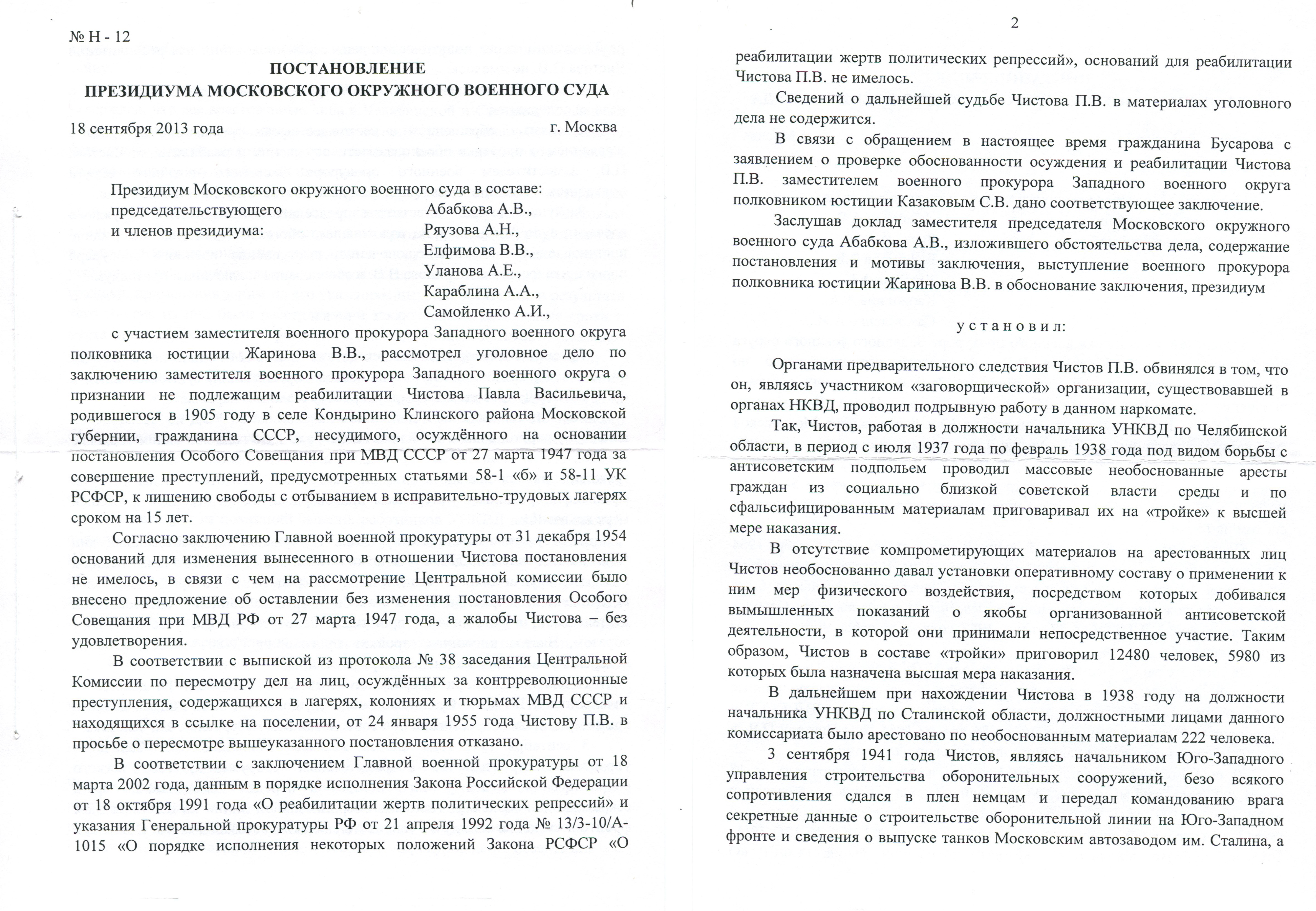 Через 30 лет после смерти Чистова юрист Александр Бусаров в рамках проекта "Немезида" обратился с прошением о его реабилитации. 18 сентября 2013 года Президиум Московского окружного военного суда рассмотрел это заявление и пришел к таким же выводам, что и Главная военная прокуратура: "… в период с 1937 по 1938 годы Чистов, являясь должностным лицом и находясь на оперативно-следственной работе в НКВД СССР, будучи начальником Управления НКВД СССР по Челябинской области, а далее – Сталинской области, из личной заинтересованности, превышая служебные полномочия и предоставленную ему власть, систематически нарушал законность, принимал активное участие в незаконных массовых репрессиях против советских граждан. При этом, используя незаконные методы ведения следствия, участвовал в необоснованных арестах и фальсификации уголовных дел по обвинению ни в чем неповинных лиц в совершении тяжких государственных преступлений, в результате чего многие из них были расстреляны или заключены на длительные сроки в места лишения свободы. … Чистов как лицо, совершившее преступления против правосудия и выдачу военной тайны, не подлежит реабилитации".