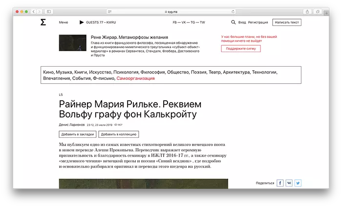 6. На «Сигме» опубликован новый перевод «Реквиема Вольфу графу фон Калькройту» Райнера Марии Рильке; перевел стихотворение Алеша Прокопьев. В отличие от перевода Пастернака, прокопьевский звучит менее возвышенно — но, пожалуй, более «конкретно»; перед нами речь человека, который силится справиться со скорбью, упорядочить ее: