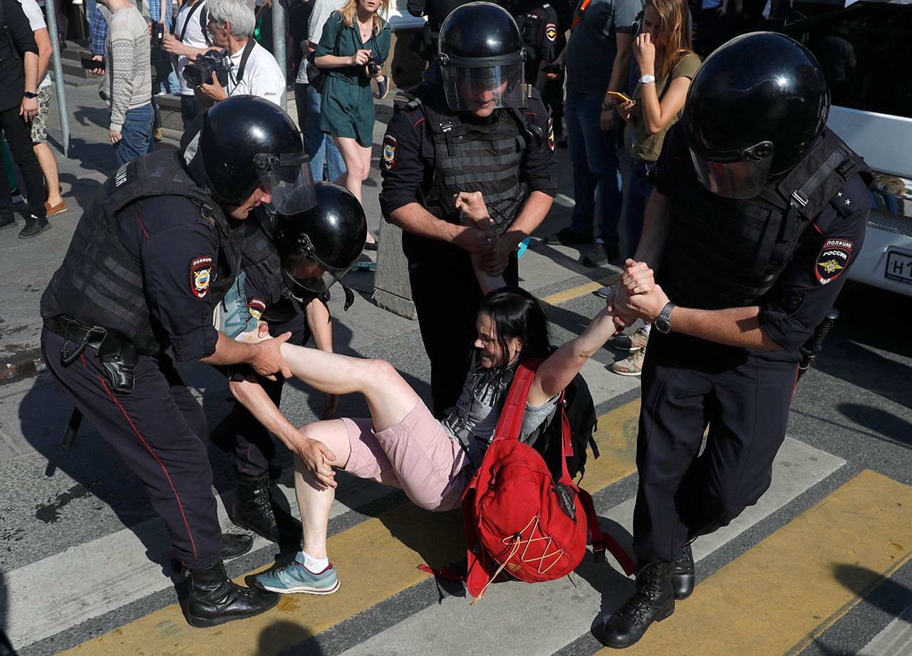 Время от времени люди в бронежилетах и касках цепью заходят в редкую толпу и выхватывают кого-нибудь из участников акции. Митингующие сопротивляются; иногда им удается отбить человека. Так мужчина, которого пытались задержать, лишается футболки — она остается в руках у росгвардейца, который со злостью бросает ее на асфальт.