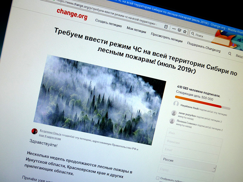 Петиция на сайте Change.Org с требованием потушить пожары в Сибири набрала более 400 тыс. подписей. Люди просят ввести режим ЧС, а также спасти от огня и дыма леса, людей и животных. За аналогичное обращение Greenpeace подписались еще почти 100 тыс. человек. В петиции активисты требуют направить дополнительные силы на борьбу с огнем, сказать правду о задымлении и помочь людям его пережить, пересмотреть зоны контроля, чтобы не повторить катастрофу.