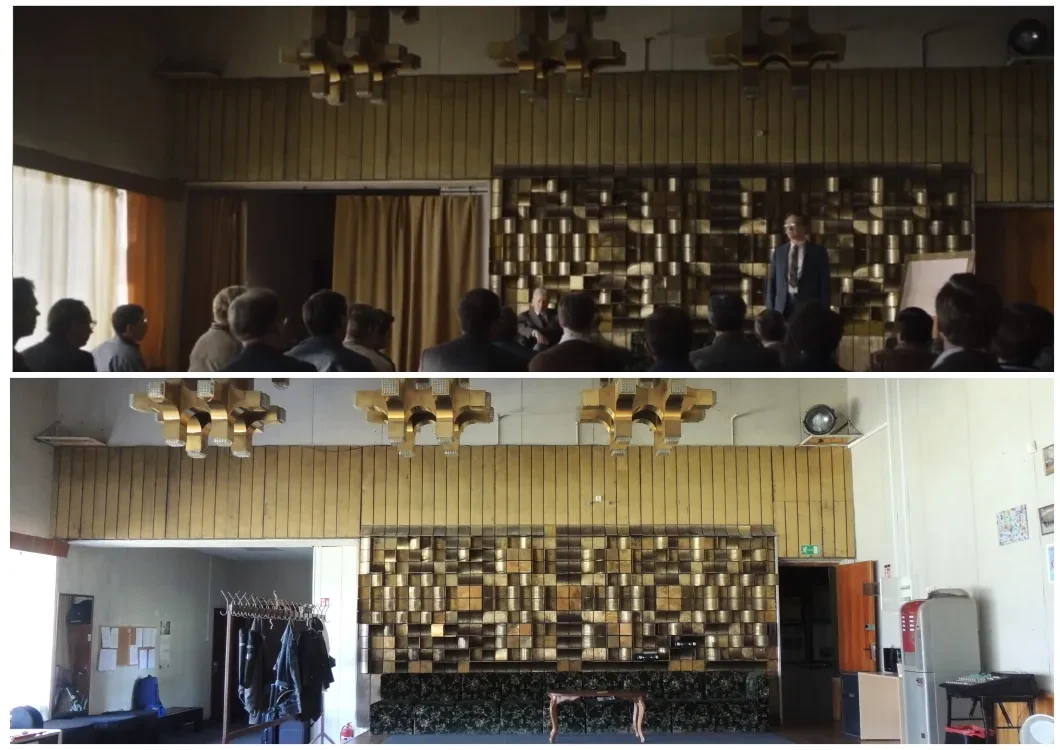 Попасть во дворец достаточно просто: вместо вахтера здесь указан только его контактный номер. Правда, зайти в зал, где снимали поиски добровольцев, без сопровождающего не получится. Для съемок зал немного переоборудовали: вдоль стены поставили старую дверь, перестелили ковер. «Съемочная группа принесла другой ковер, который выглядел более аутентично. Ковер был отпечатан, совсем свежий и вонял краской. После съемок команда оставила нам этот ковер. Мы потерпели два дня и позвонили им, попросили забрать — этот запах невозможно было терпеть», — рассказывает художественный руководитель и дирижер оркестра Эймантас Анскайтис.