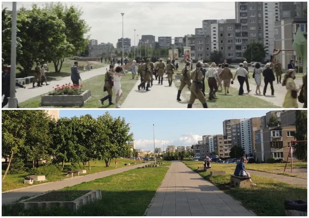 «Район остался доволен. Для фильма посадили несколько деревьев, все клумбы были в цветах», — рассказывает Зегмундас, проходя мимо пустующей цветочницы. «Оттуда шли пионеры с галстуками. Там висели лозунги, что-то про коммунизм. Чуть дальше собирали массовку, инструктировали, там же и рассчитывались за съемочные дни», — вспоминает мужчина.