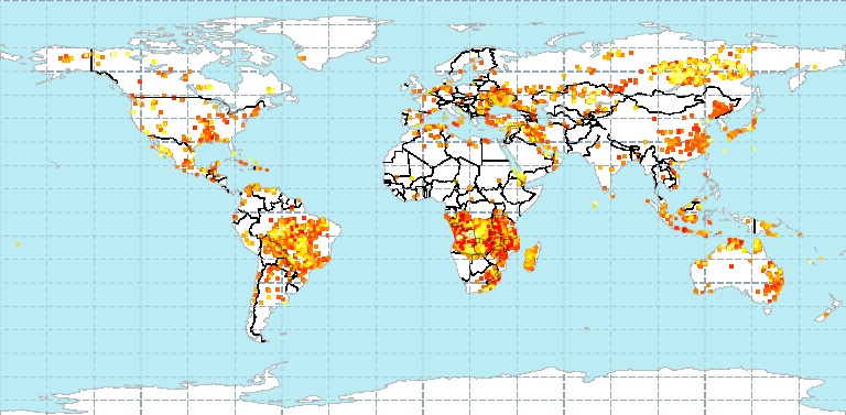 Судя по карте, основанной на данных мониторинга ECMWF, летом 2019 года природные пожары охватили всю планету — очаги заметны не только в России, но и в США, Бразилии, странах Африки и других местах.