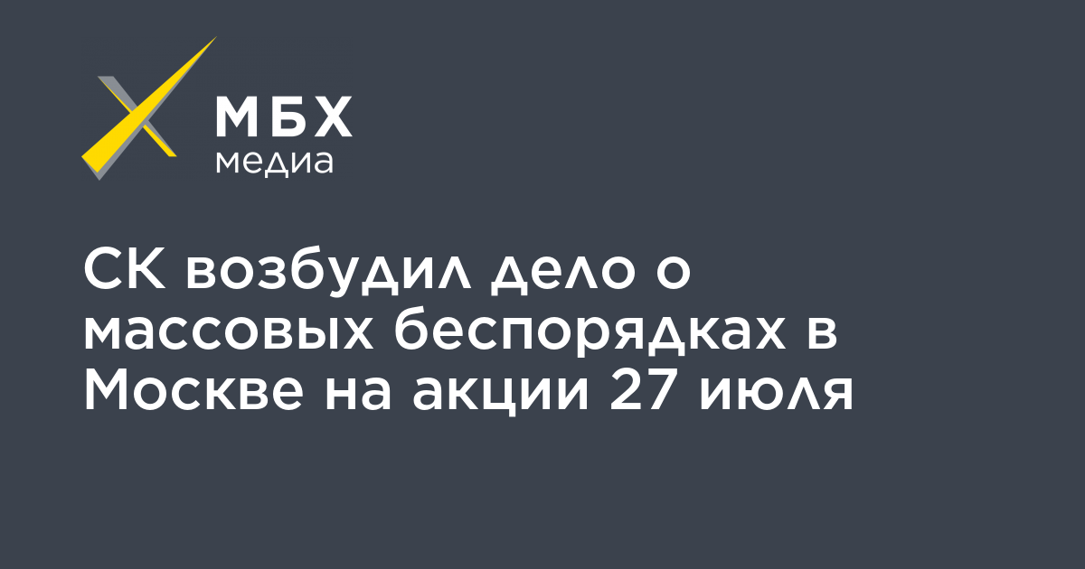 Следственный комитет Москвы возбудил уголовное дело о массовых беспорядках (ст. 212 УК) на акции 27 июля в поддержку незарегистрированных кандидатов в Мосгордуму, сообщается на сайте ведомства.