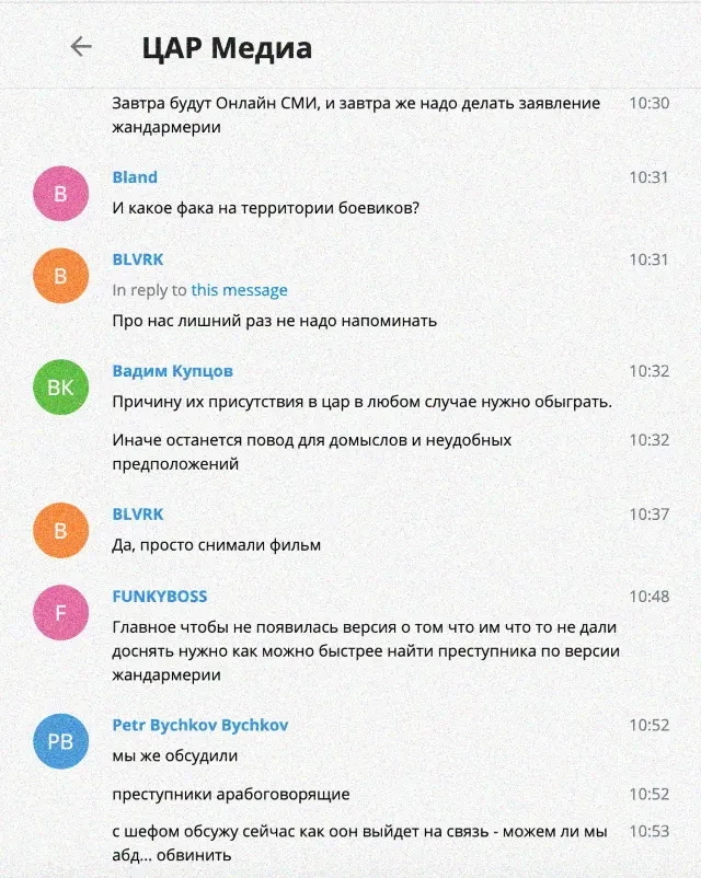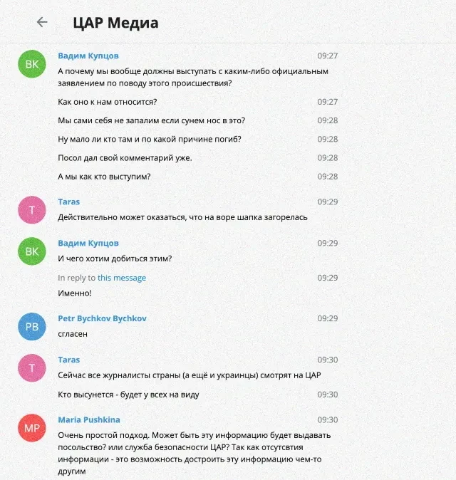 Специалистам «Досье» удалось получить доступ к внутренней переписке сотрудников африканского проекта Пригожина, которая велась в мессенджере Telegram в групповом чате с названием «ЦАР Медиа». Переписка показывает, как после убийства журналистов люди Пригожина начали планировать «версии» преступления и информационную политику освещения этого события. Поражает, что планируют они не только «активность» в соцсетях и СМИ, но и официальные заявления жандармерии ЦАР.