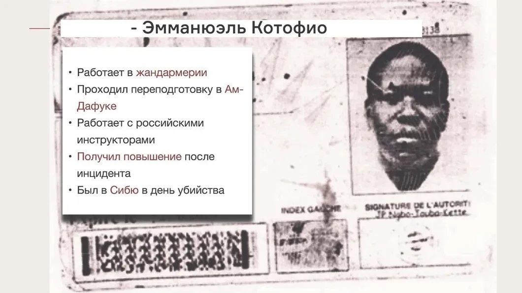 * Эммануэль Котофио был опознан солдатами FACA, находившимися в ночь убийства на КПП в Сибю. Согласно показаниям свидетелей, около 19.00 30 июля непосредственно перед машиной команды журналистов проехал другой автомобиль, который вернулся на КПП в Сибю около 20.00. В 20.45 водитель журналистов сообщил о нападении жителям деревни Кпаку. Вместе с Котофио в машине находились трое белых людей, предположительно русских.