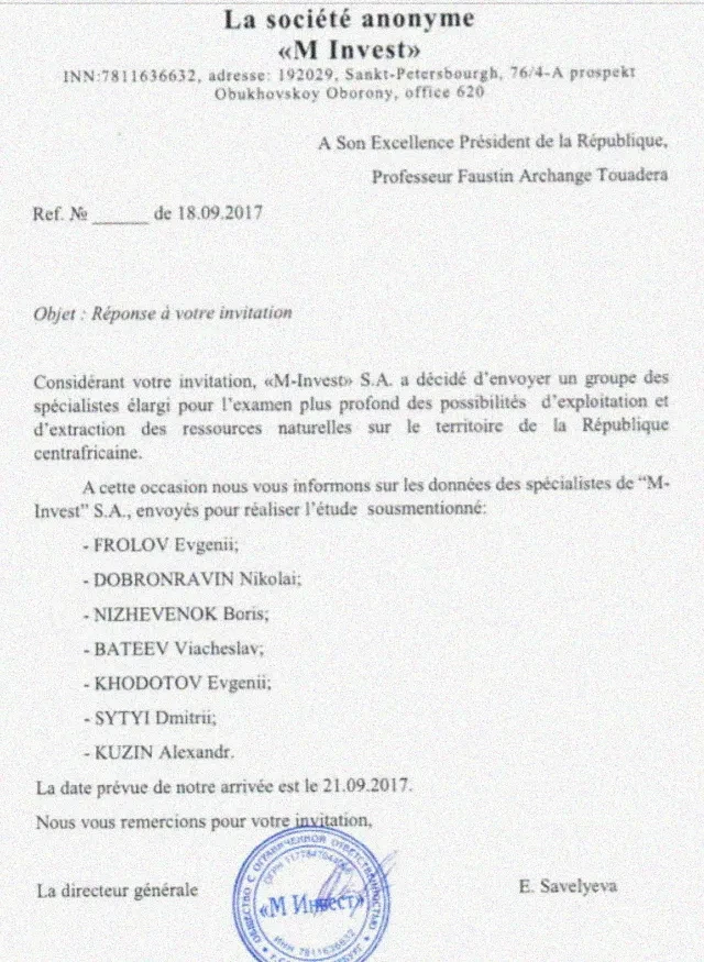 Данные, полученные Центром «Досье», говорят о том, что Евгений Пригожин и его сотрудники активно работают над центральноафриканским проектом с 2017 года. 21 сентября 2017 года семь специалистов компании «М Инвест» (Евгений Фролов, Николай Добронравин, Борис Нижевенков, Вячеслав Ботеев, Евгений Ходотов, Дмитрий Сытый, Александр Кузин) по приглашению президента ЦАР Фостен-Арканжа Туадеры прибыли в ЦАР для более глубокого изучения возможностей разведки и добычи природных ресурсов на территории страны.