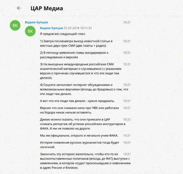 Более того, в сообщении Купцова прямо говорится о том, что версию случившегося необходимо «придумать», а информацию о том, что журналисты планировали съемки о деятельности ЧВК, — скрыть: «А вот что эти люди там делали — нужно придумать. Версии что они снимали кино про ЧВК или работали на Ходора никак нельзя оставлять. Думаю можно сказать, что они приехали в ЦАР снимать репортаж об успехах российских инструктаров в ФАКА. И им не повезло на дороге. Мы же официально, открыто и легально учим ФАКА. История появления русских журналистов тогда будет логичной…»