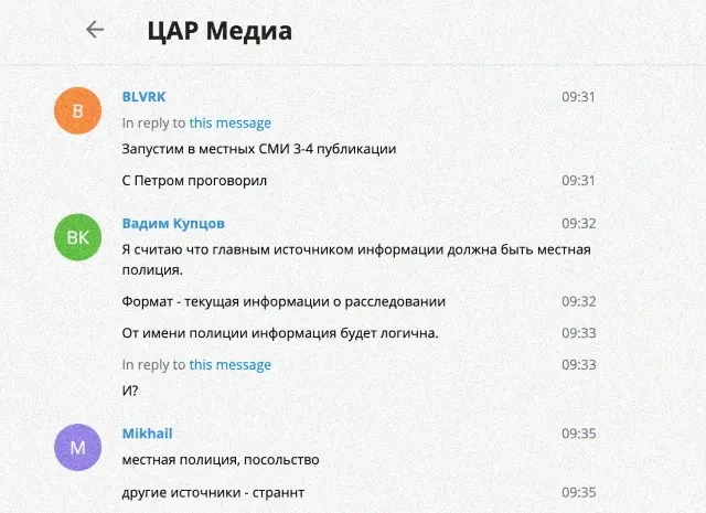 В итоге участники чата договариваются «запустить в местные СМИ 3–4 публикации» и приходят к выводу, что «главным источником информации должна быть местная полиция и посольство».