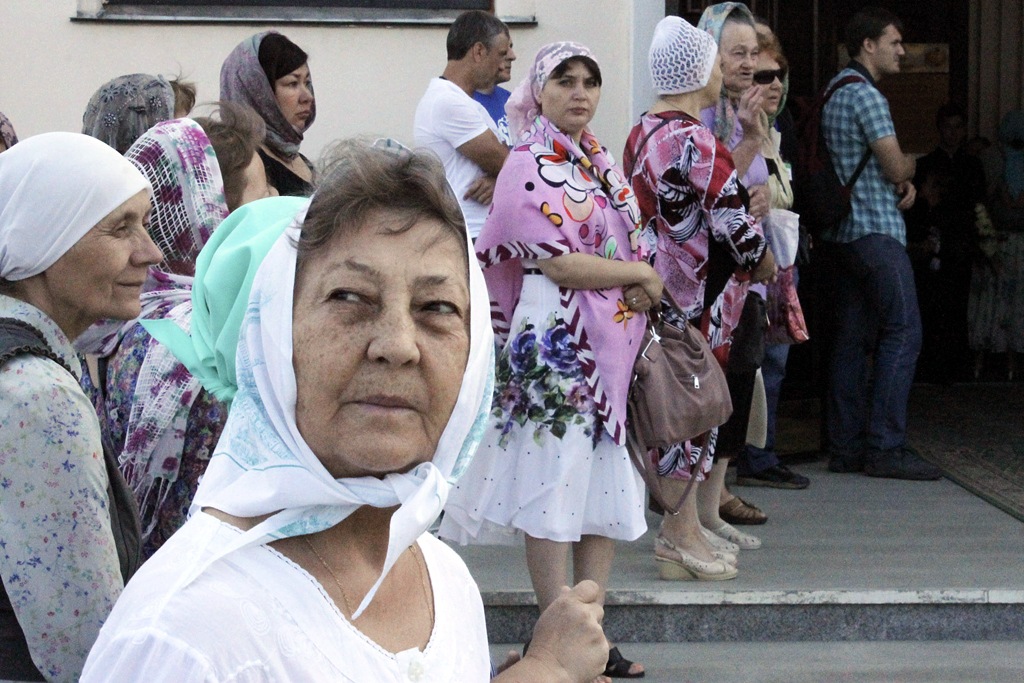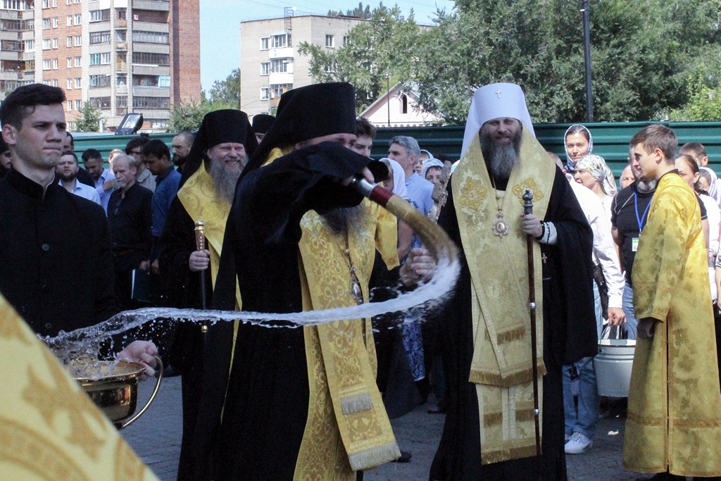 На улице процессия огибает собор. В центре толпы епископ Барабинский и Каинский Феодосий окропляет монахинь и прихожан. Он размахивает кропилом так, чтобы вода освятила каждого. Верующие женщины переживают, если на них не попало.