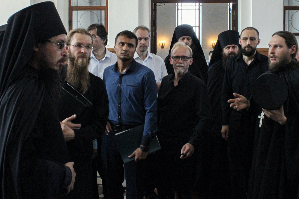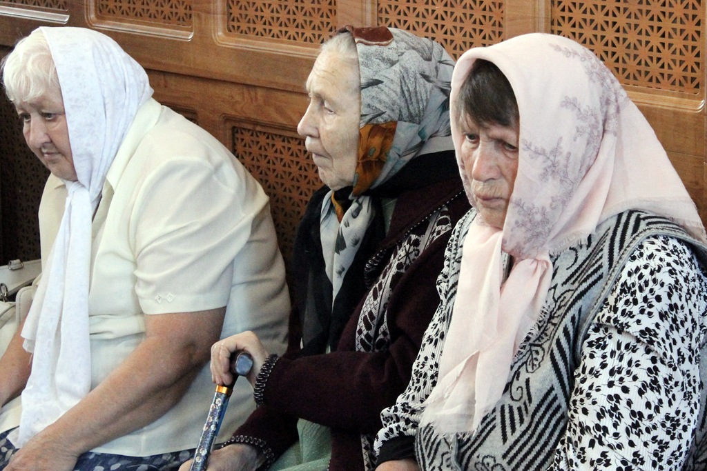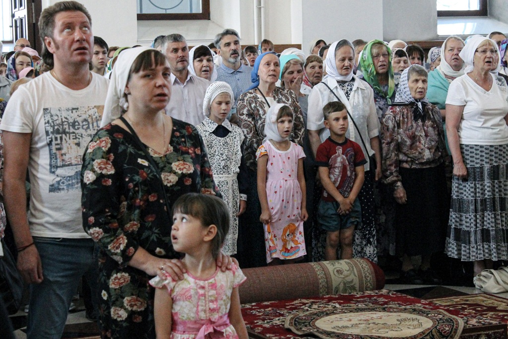 Литургия проходит под пение хора с балкона. По словам сотрудника собора, находиться там можно только с «благословением на корреспонденцию» от настоятеля, иеромонаха Николая. После часа священнослужения в наполненном зале некоторые прихожане вытирают пот с лица и открывают окна, пока запах воска смешивается с ароматом ладана. На улице в машине реанимации пьет чай женщина, которой поплохело «из-за низкого давления».