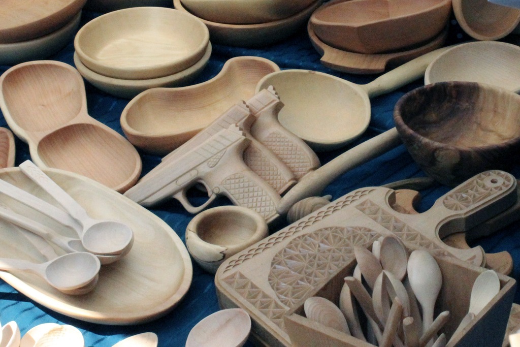 Справа зрелая пара расставила деревянную посуду. Среди тарелок, ложек и четок продаются деревянные пистолеты Макарова.